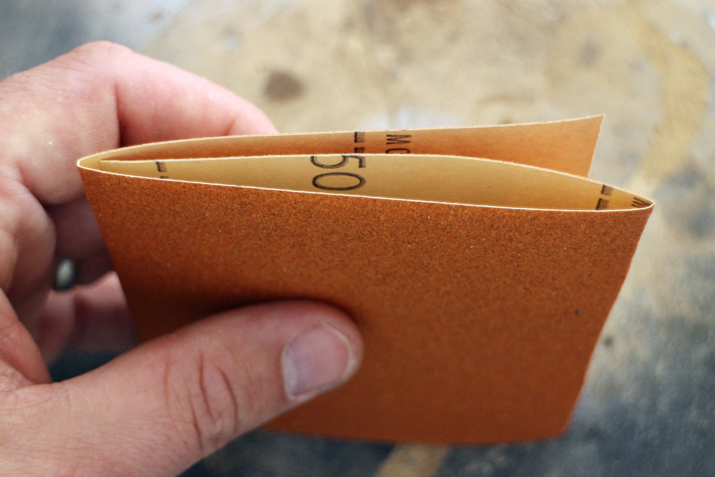 Folds are pressed into the sandpaper separating it into equal thirds. The grit face will be facing the backside of the sandpaper and not be worn down prematurely.