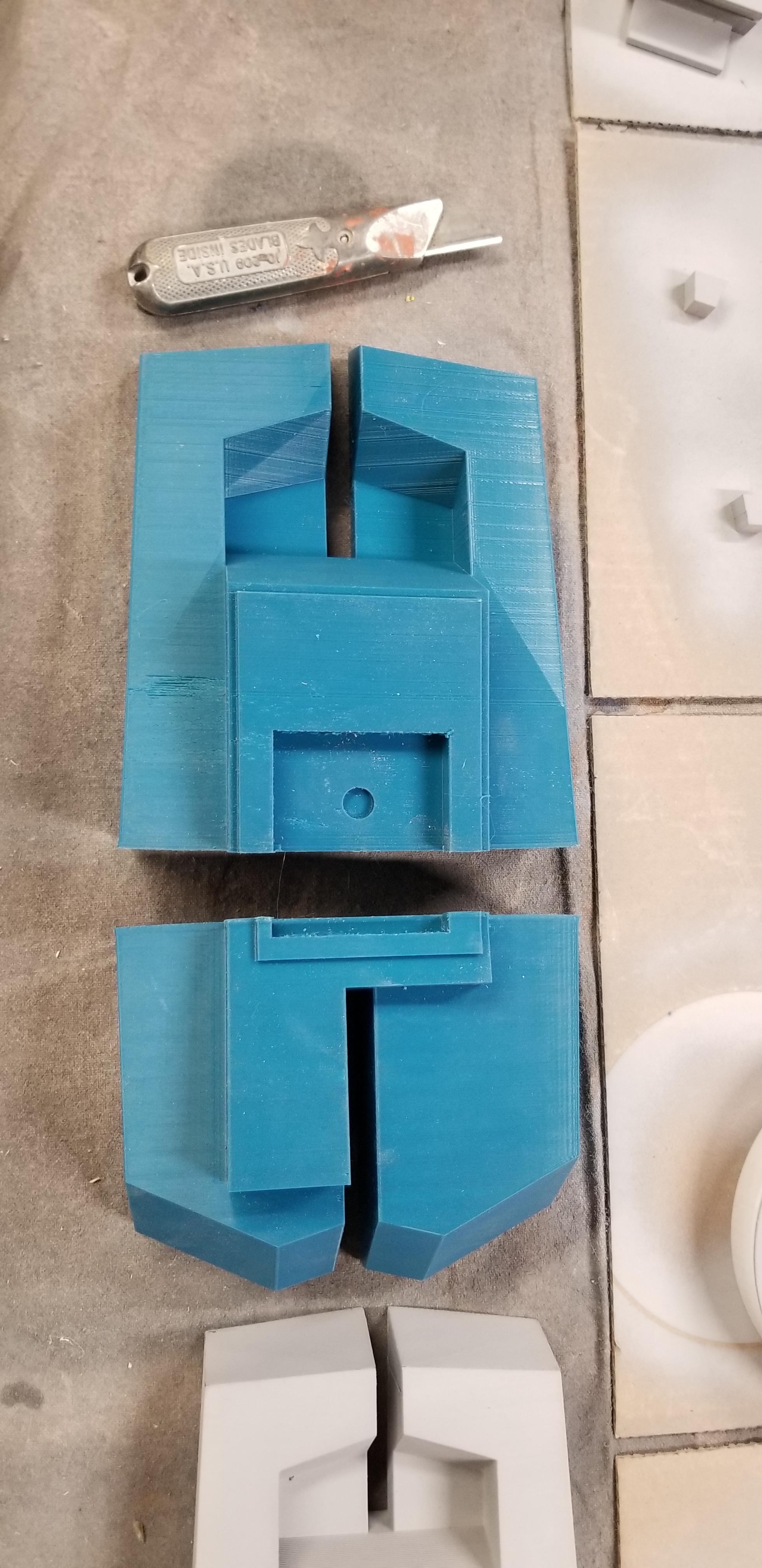 Some features were not included into the CAD model for allowing me to perform a more accurate placement of key components like the fan and switch holes on the rear of the helmet. Sometimes looking at a CAD screen can deceive your eye as being correct and then it just doesn't look right when in 3D printed out. The helmet modules are very hard to get them aligned (a rectangle on a multiple curved surface) to the helmet. Hence I located them, and cut the fan and switch holes by hand to get it perfect.