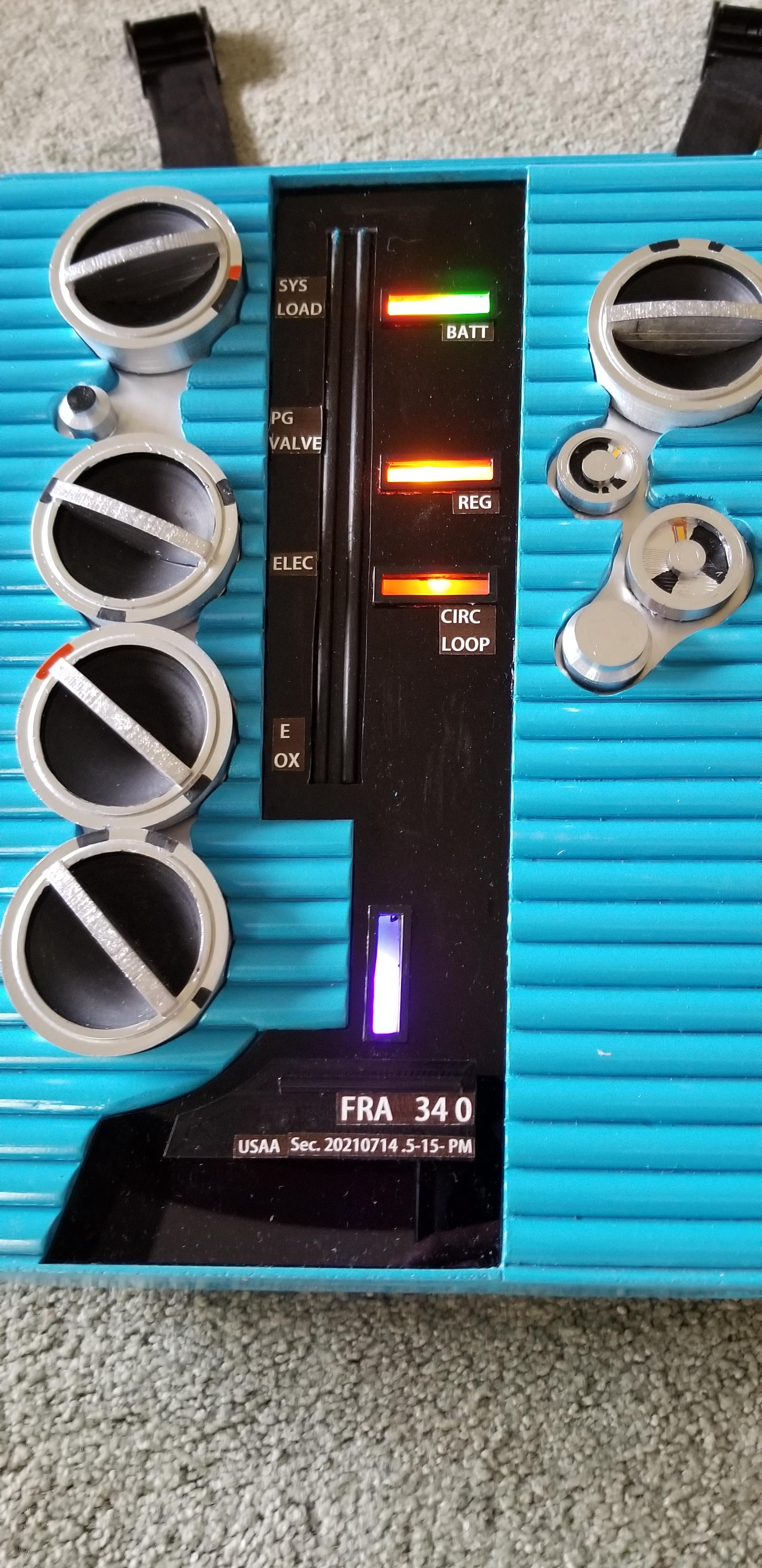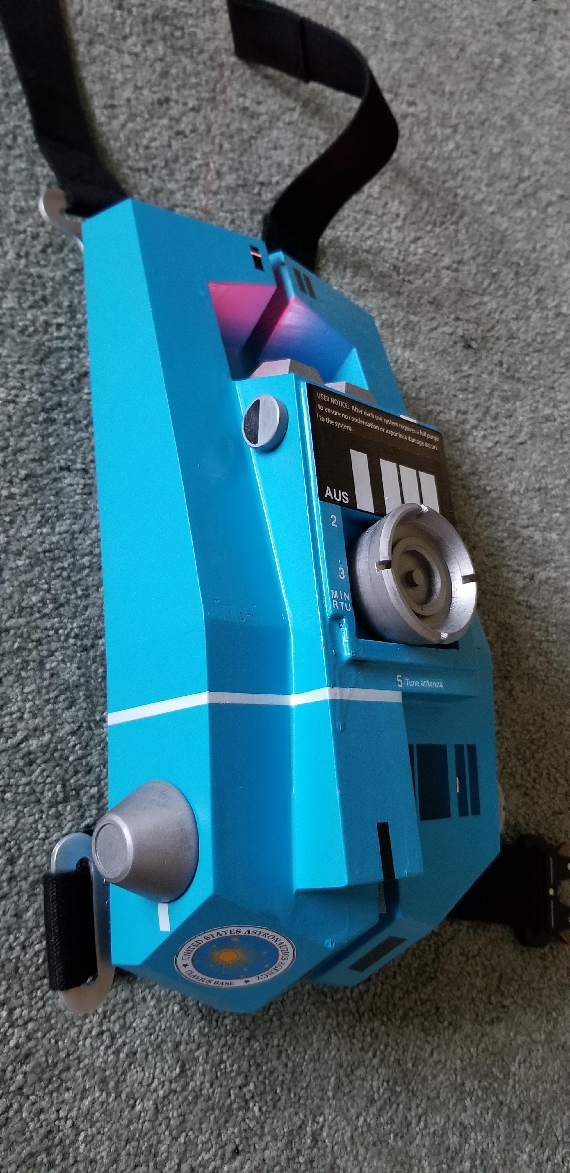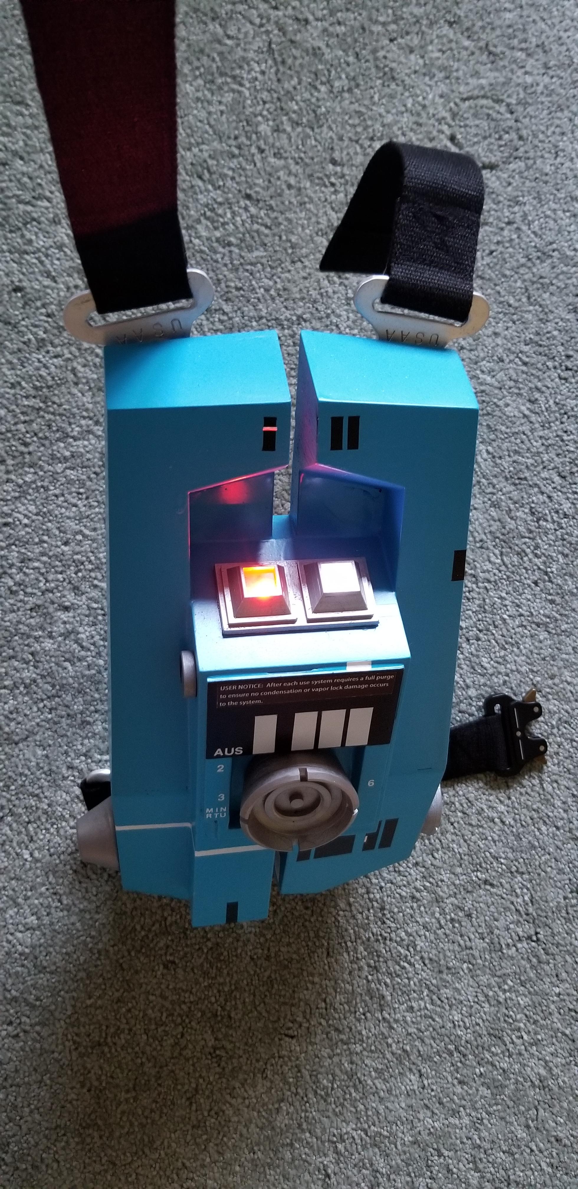 The LED lighting is optional as this is not seen in the movie. I added it for more realism / interest. This can be done in a variety of ways but what I did was to use a surplus arduino mega (overkill) I had laying around. Just keep in mind that the easiest most reliable way to light up LEDs is to use a 220 ohm resistor on each LED to be lit off the arduino. If you try to pair up LEDs off single resistors, one LED will draw more current than the other and lead to different levels of light output. By using the Arduino, you can also pulse the leds and get a special effect as if the back pack is actually functioning.