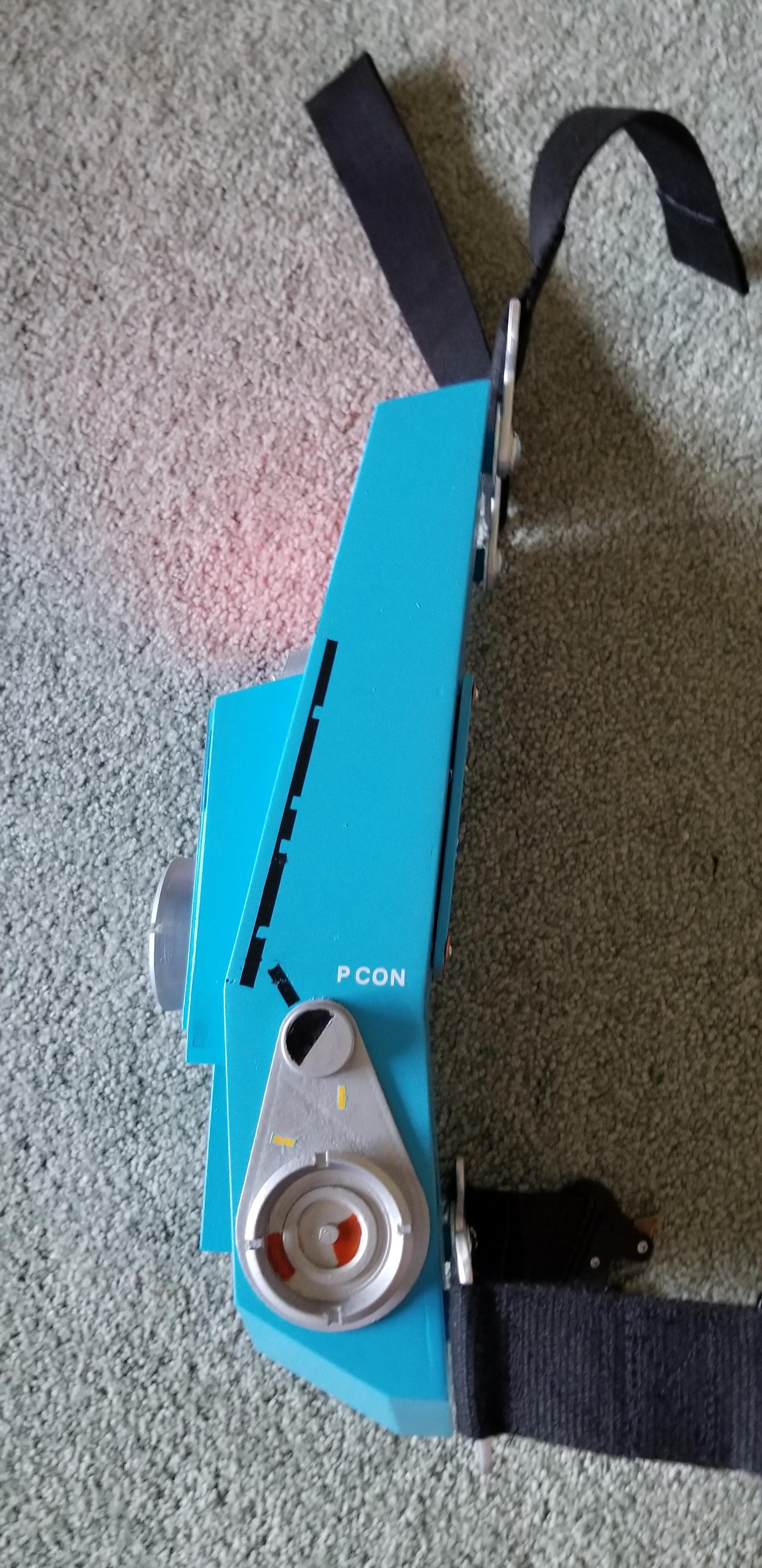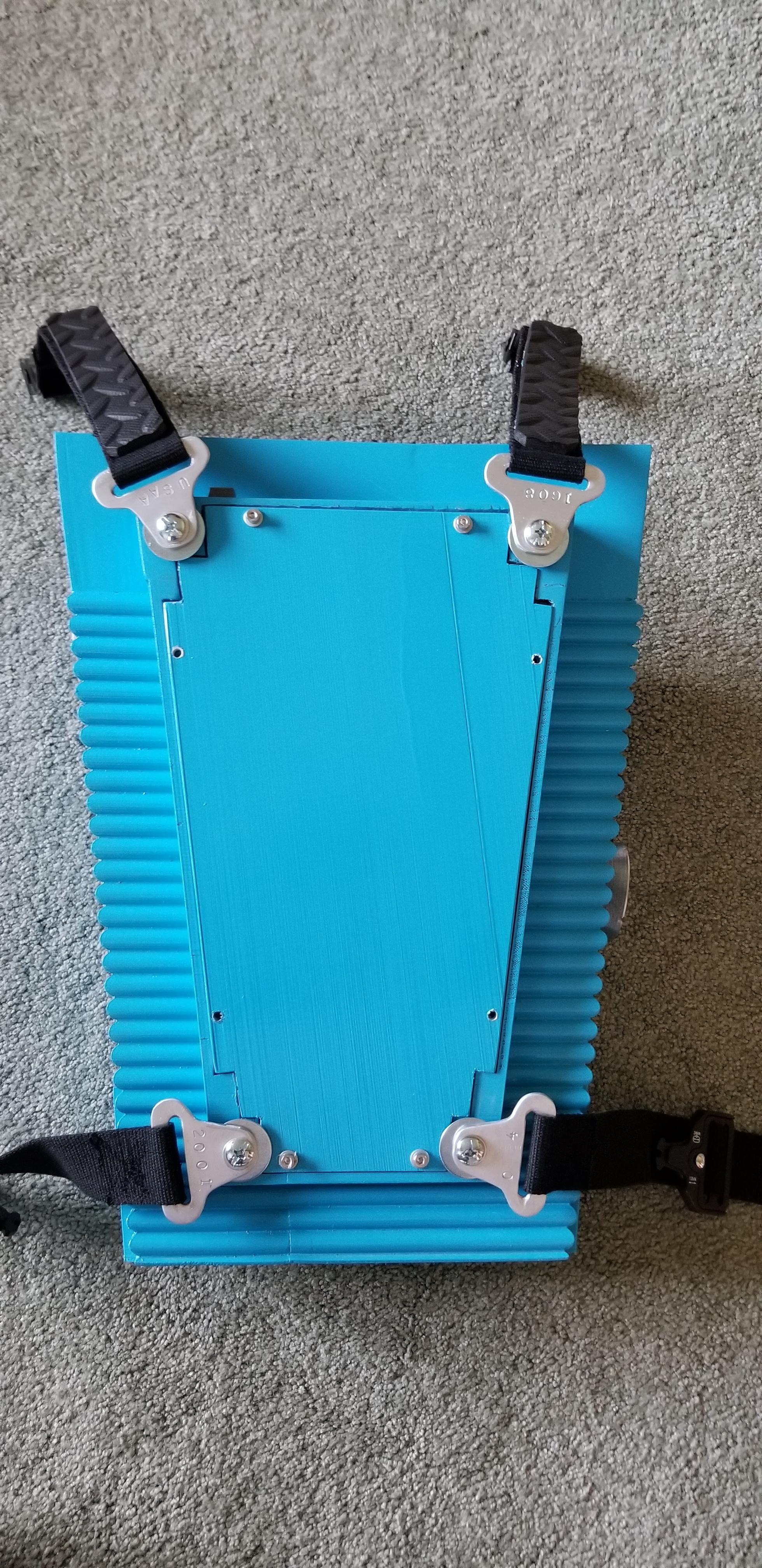 The strap connectors were hand cut out of a 2" x 1/8" aluminum bar. Then they were stacked together and filed down to become a matched set around their profile shape. Their slots were cut in using a dremel disk and then filed again by hand. While the slots are not 100% perfectly cloned to each other the webbing does a great job concealing any noticeable flaws between the brackets.