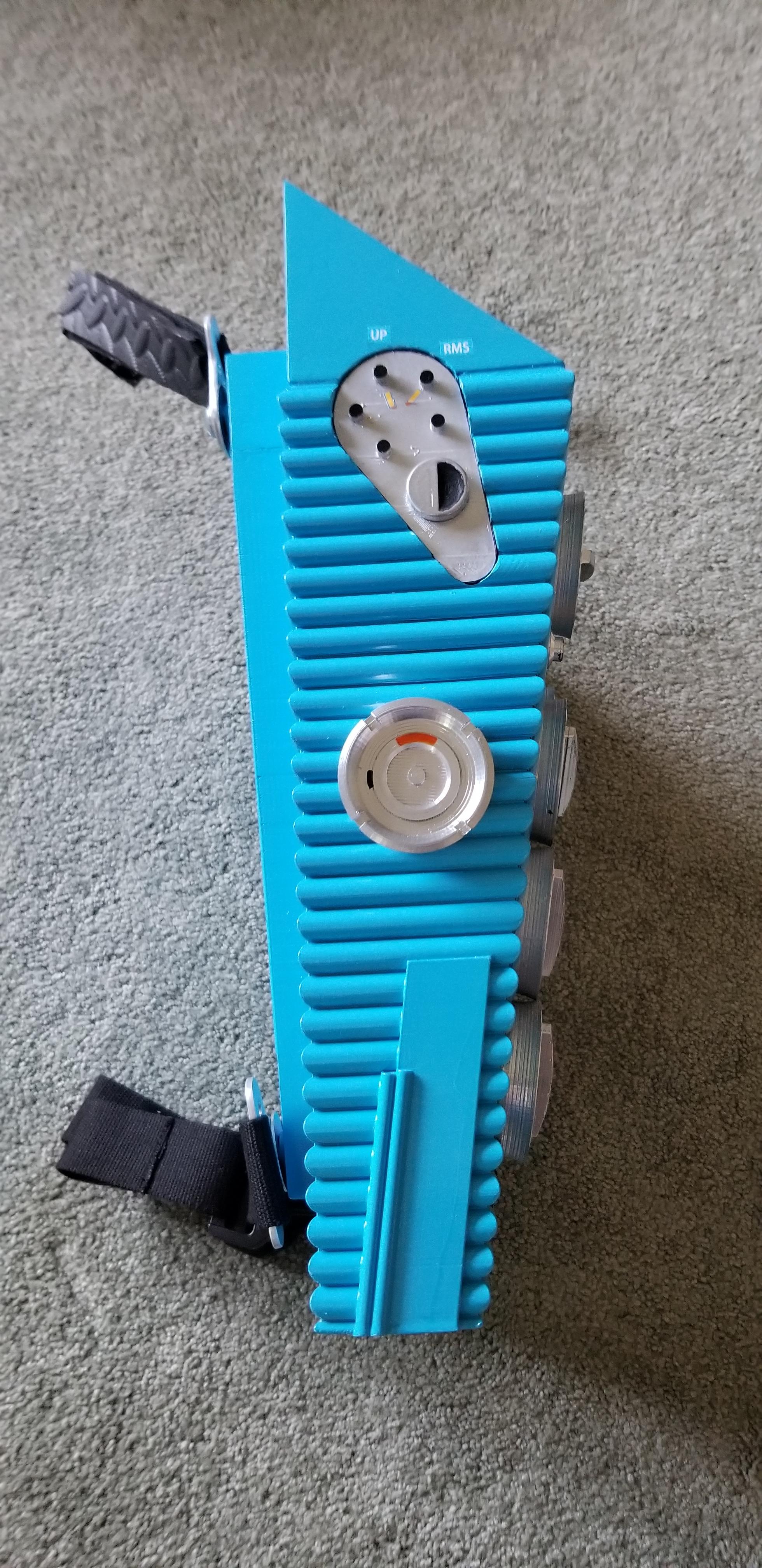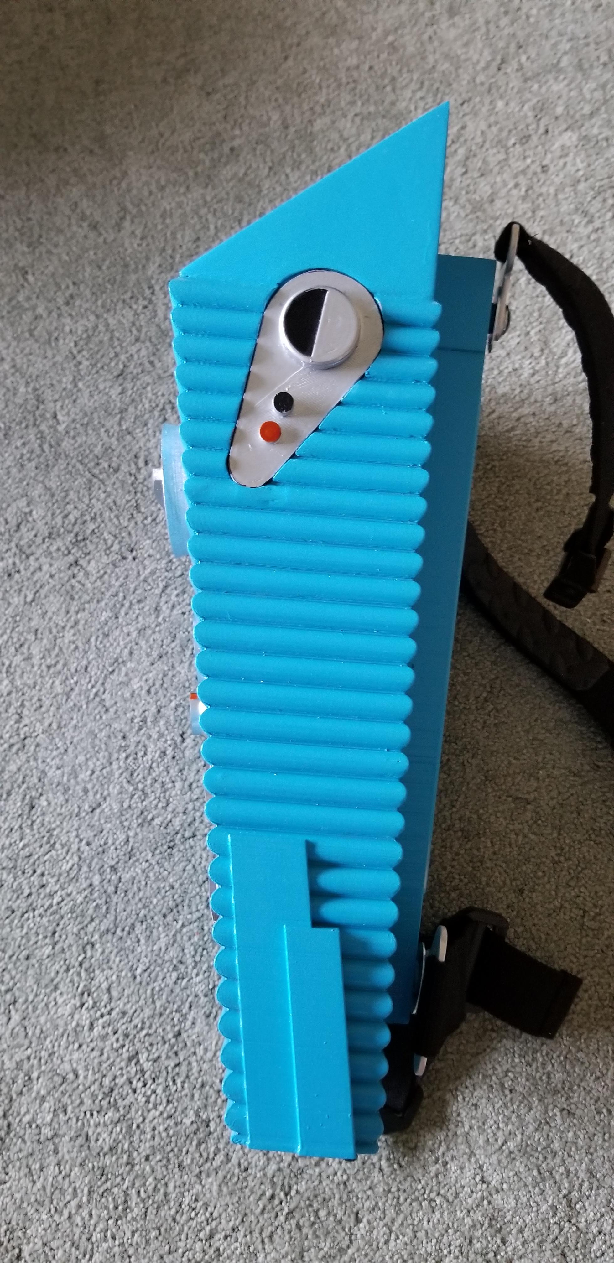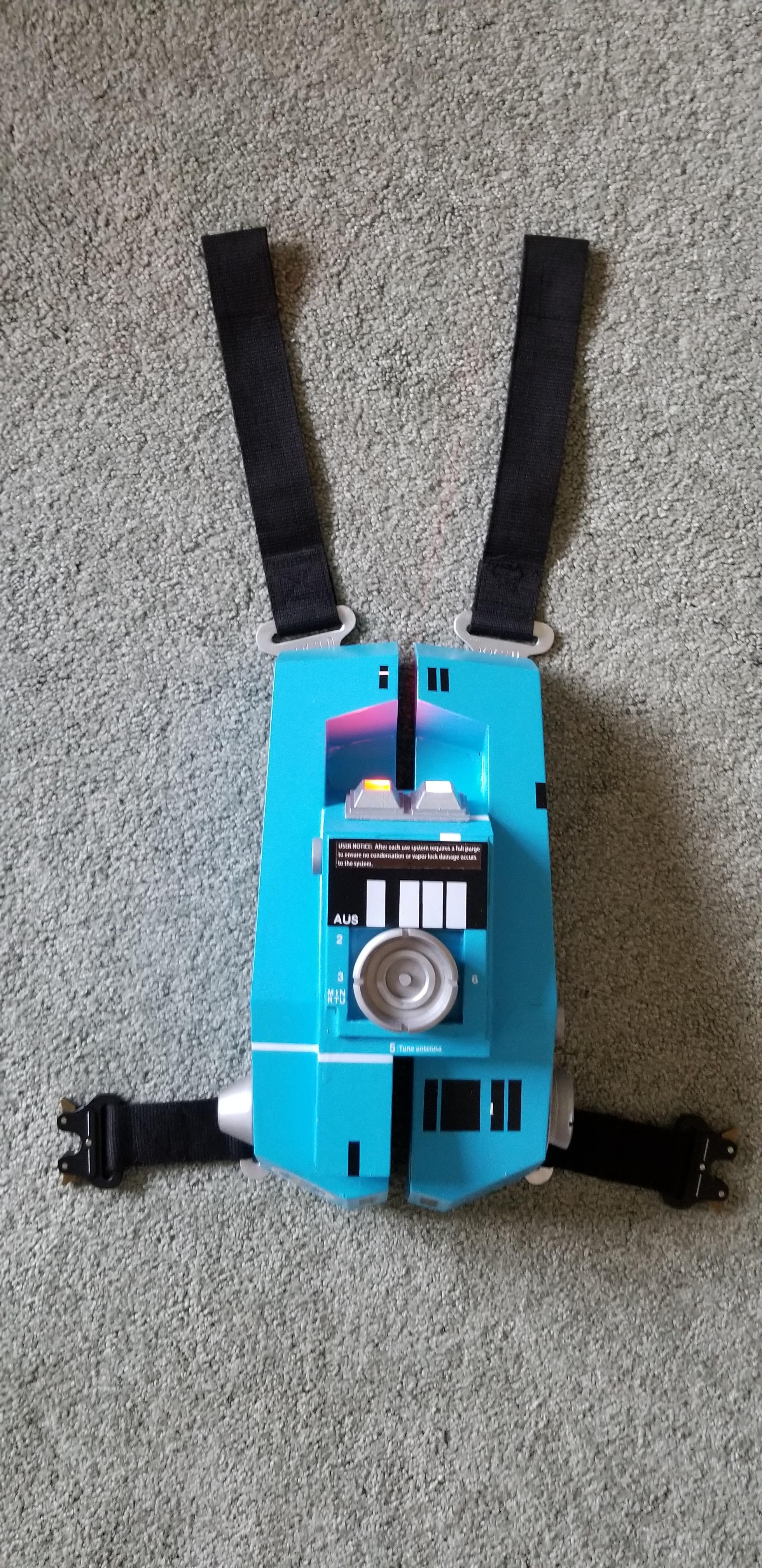 Back Pack: ~ 2.5 Rolls PLA. 2" x 1/8" x 36" aluminum bar, 4-20 threaded inserts (4), 1/8" thick black plexiglass 8x 18", 1.5" wide black webbing 4', Webbing Clips (4), 3mm leds Assorted colors (20), Arduino Mega, Push on/off switch, USB Battery pack, velcro strips (3"), custom decals.