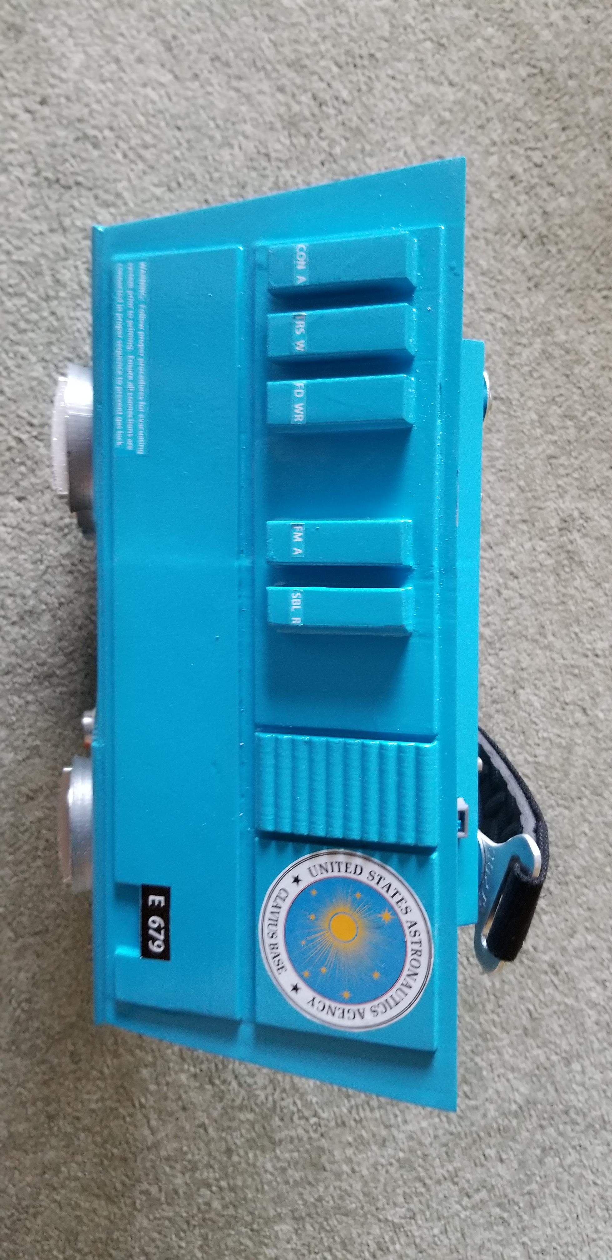 I was able to get a much better representation of the Clavius suit (as compared to my Discovery suit) because there was an actual "film used" suit at auction several years ago. Those photographs in the auction catalogue show significant detail to the suit and environmental equipment and thus captured much more detail than anything available for Discovery suits. Additionally, there was a tour of all of Stanley Kubric's work shown around the world which had a commissioned replica suit used on the tour. Coupled together, these references resulted in a highly accurate model here. The Discover suit, jet pack, and chest box details were much harder to find and thus have some liberties taken where no accurate references exist.