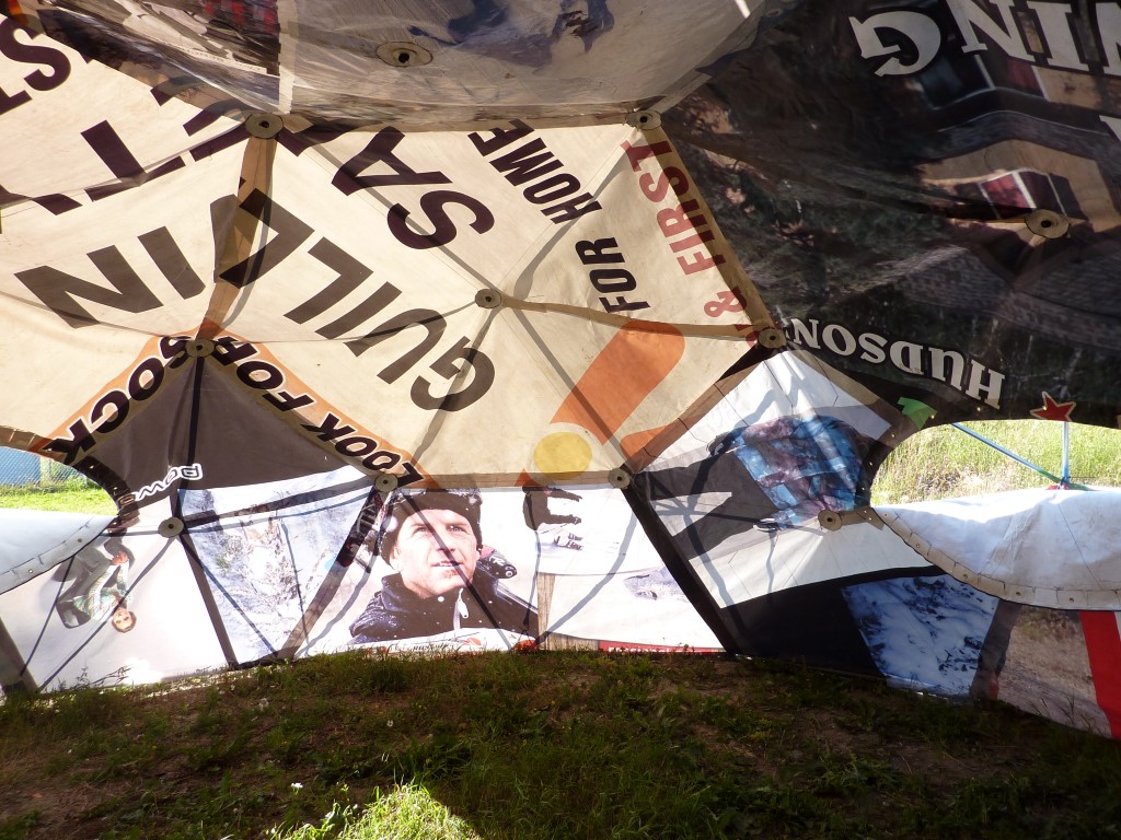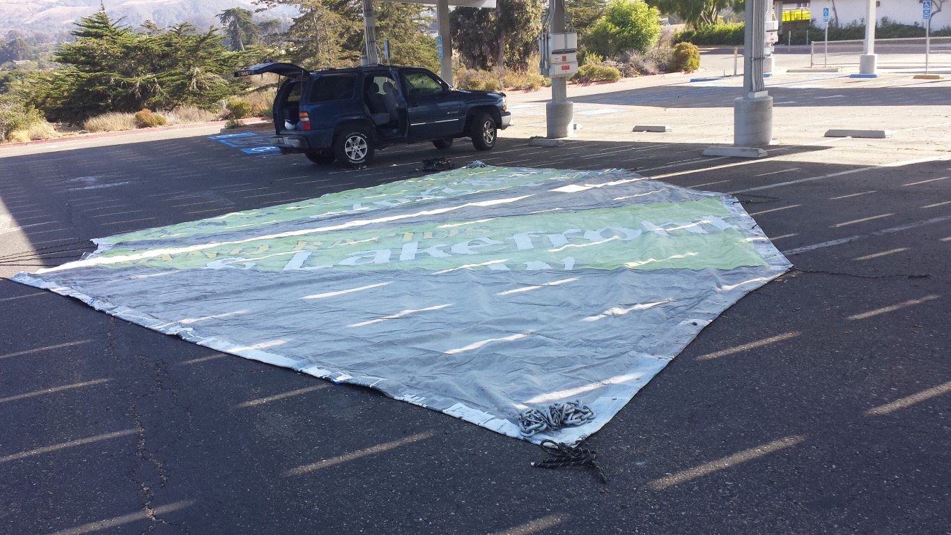 In 2013 I went with a group of people that wanted to have a communal shade area, so I made an awning from more billboard fabric, rope and some 1" EMT poles.