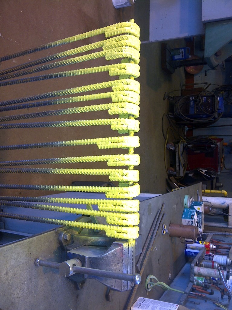 This is very important. This dome is a 500lb sail in a windstorm; I watched it move 20ft across my back yard before I staked it down. For this I used 2 foot long rebar stakes made by bending 5/8" rebar and welding a reinforcement to the bent section to help cope with the hammering in and pulling out.