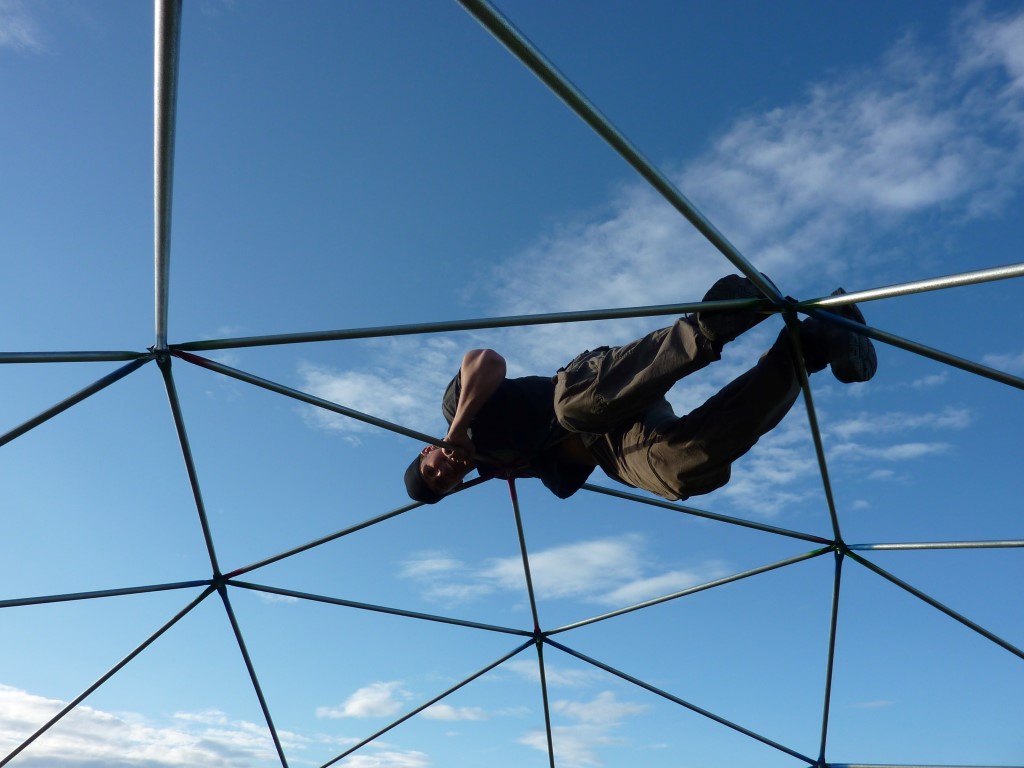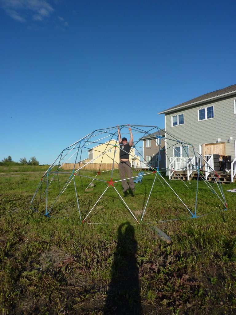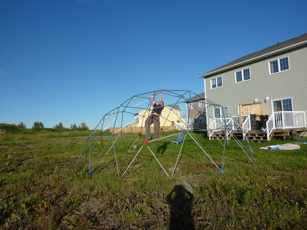 Use a helper: not just for making light work, but for holding sections of the incomplete dome up while you go get more struts to put it together. The structure will be very weak at first and you can bend your struts. This isn't usually a big deal as the struts are quite resilient, but it's frustrating. Having a helper is a good idea.