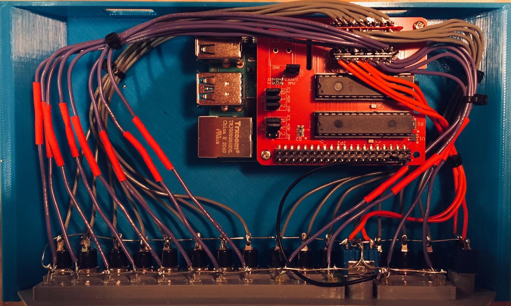 The front panel lights, buttons, and switches are connected to the Raspberry Pi through the Port Extender pictured above. The port extender came with standoffs, so I used two diagonal corner holes on the Raspberry Pi to mount it to the bottom frame, and the opposite two corner holes with the standoffs to support the hat. Seems reasonably solid.