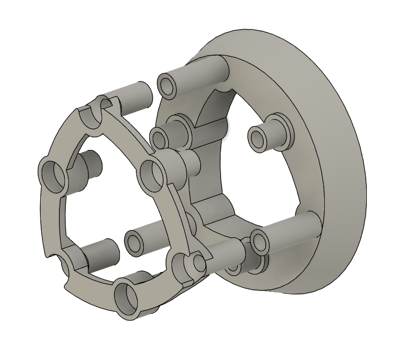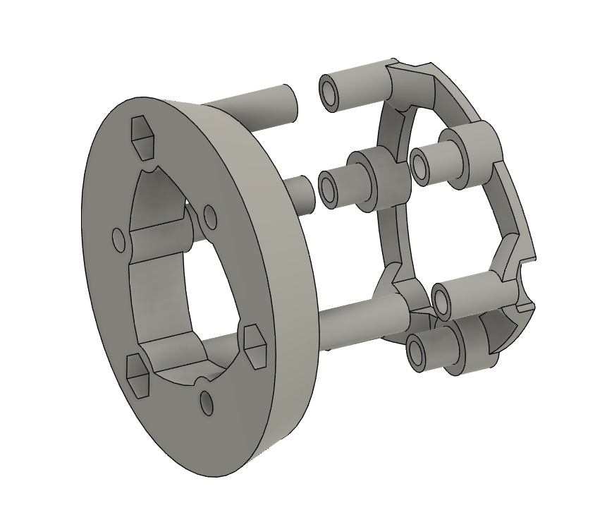 The hollow gear is centered on the planet carrier using three ball bearings that run in slots within the hollow gear, and the screws that run through the planets attach the sprockets to the main body of the tank. The whole component is designed to be attachable after the main body has been completed, and therefore also enables a simple replacement of single gears in case of wear and tear.