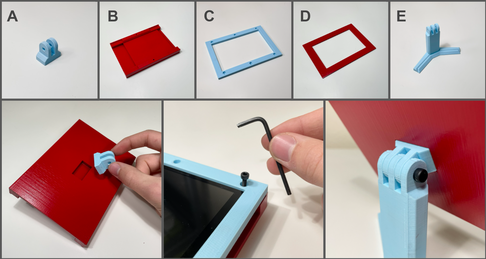 - Put the monitor and stand [E] and frame together by joining their hinge pieces with one M4 20mm bolt.