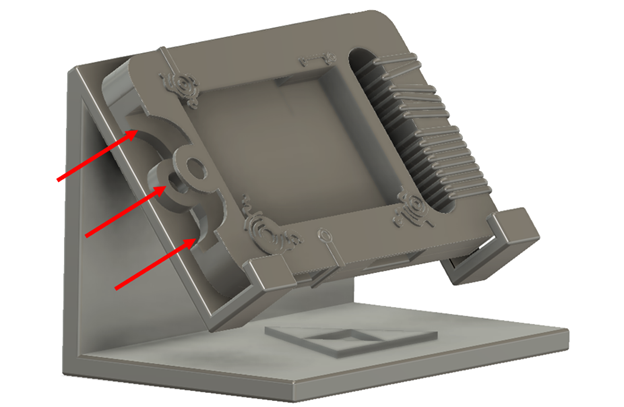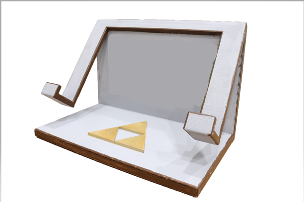 I started by creating the general shape of the Sheikah Slate. Then, I imported an image on top of the shape and traced each element of the Sheikah Slate using the sketch function. Then I extruded each piece and added some fillets to remove the sharp edges. I used a sweep feature for the stringy parts on the handle of the Sheikah Slate as well. Finally, for the slate, I created a rectangle just a bit larger than my switch and extruded it through the majority of shell so my switch could fit inside (see the picture with red arrows). For the stand, I measured what angle would be best so that I could comfortably rest the Sheikah Slate on it and not have to contort my neck in such a way to get a good view of the game. I drew the side profile of the stand and extruded it. Then I used the mirror function to make it the same on the other side. Finally, I put a Triforce on the bottom for aesthetics. Nothing that 3 easy triangles won't be able to manage. Then I extruded the Triforce and added some fillets.