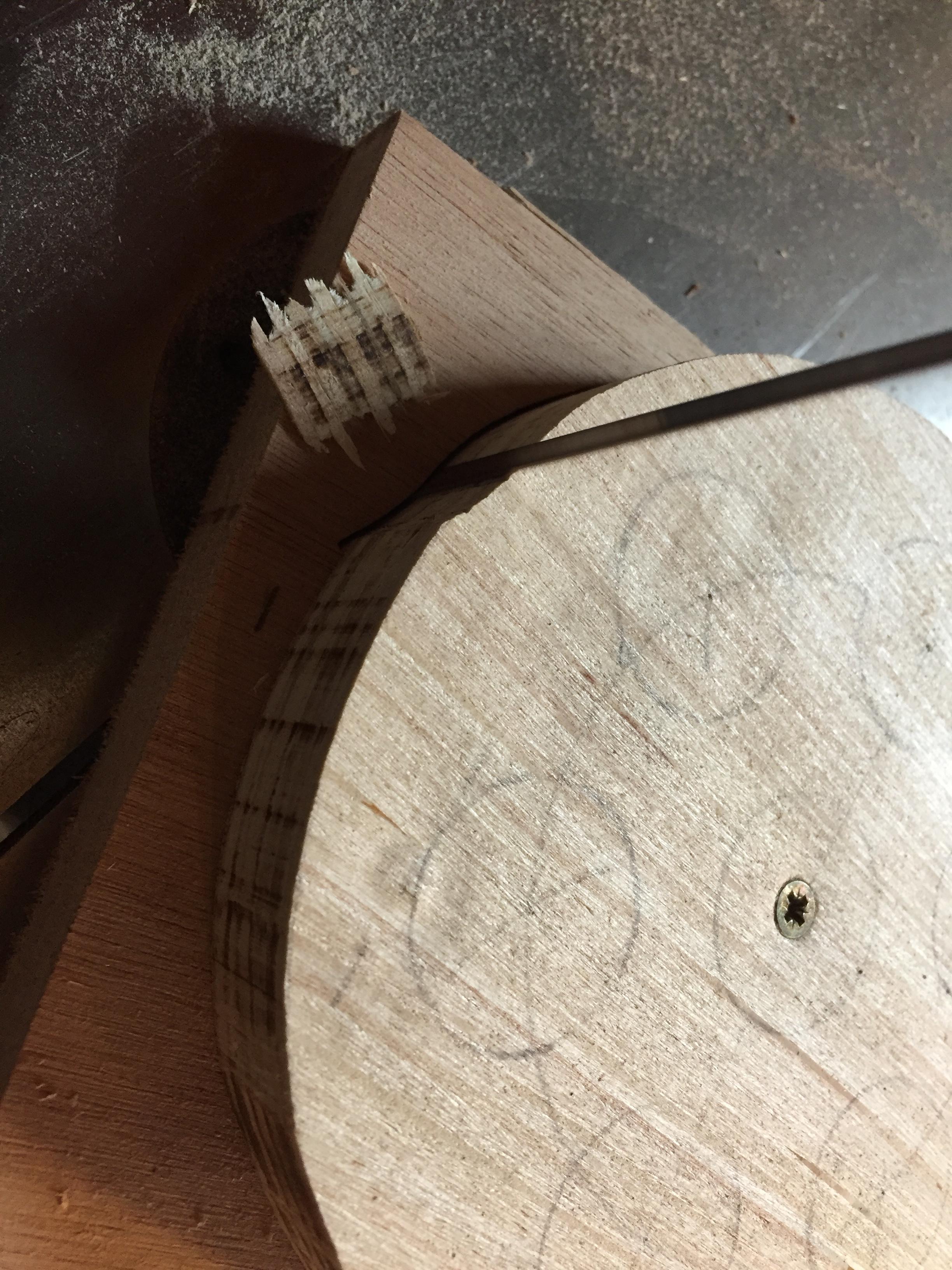 I long hesitated on the number of rods, and I ended up with 6 around and 1 in the center. It is easy to trace with a compas, and the size is reasonable. I cut a first disk in thick plywood with the scroll saw and I used this first disk as a template for the next ones made out of thinner plywood. Everything went quite well until I made a knotch in the first disk (and the other one of course).