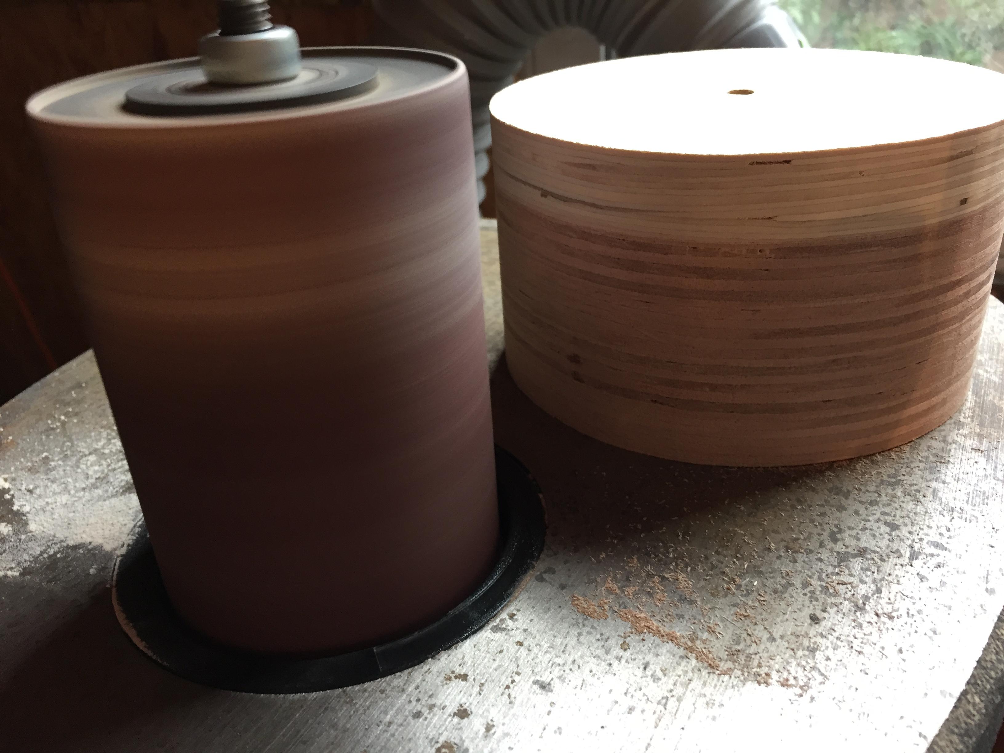 I attached some disks together and sanded the edges on the drum sander to smooth the edges and get a quite circular shape. I repeated with the rest of the disks.