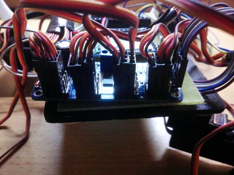 Up on starting, all servos will be initialized to a "zero" position and now you can attach the Base, Coxa, Femur and Tibia together like the photos above, Coxa 45 degrees to the edge of base, Femur 30 degrees to Coxa and make Tibia vertical and slightly bend outside. remember keep the power on so that the servos will keep the "zero" position when you are attaching them. In the Arduino code, you can adjust the servo offset values to make the servos have a more accurate positions.
