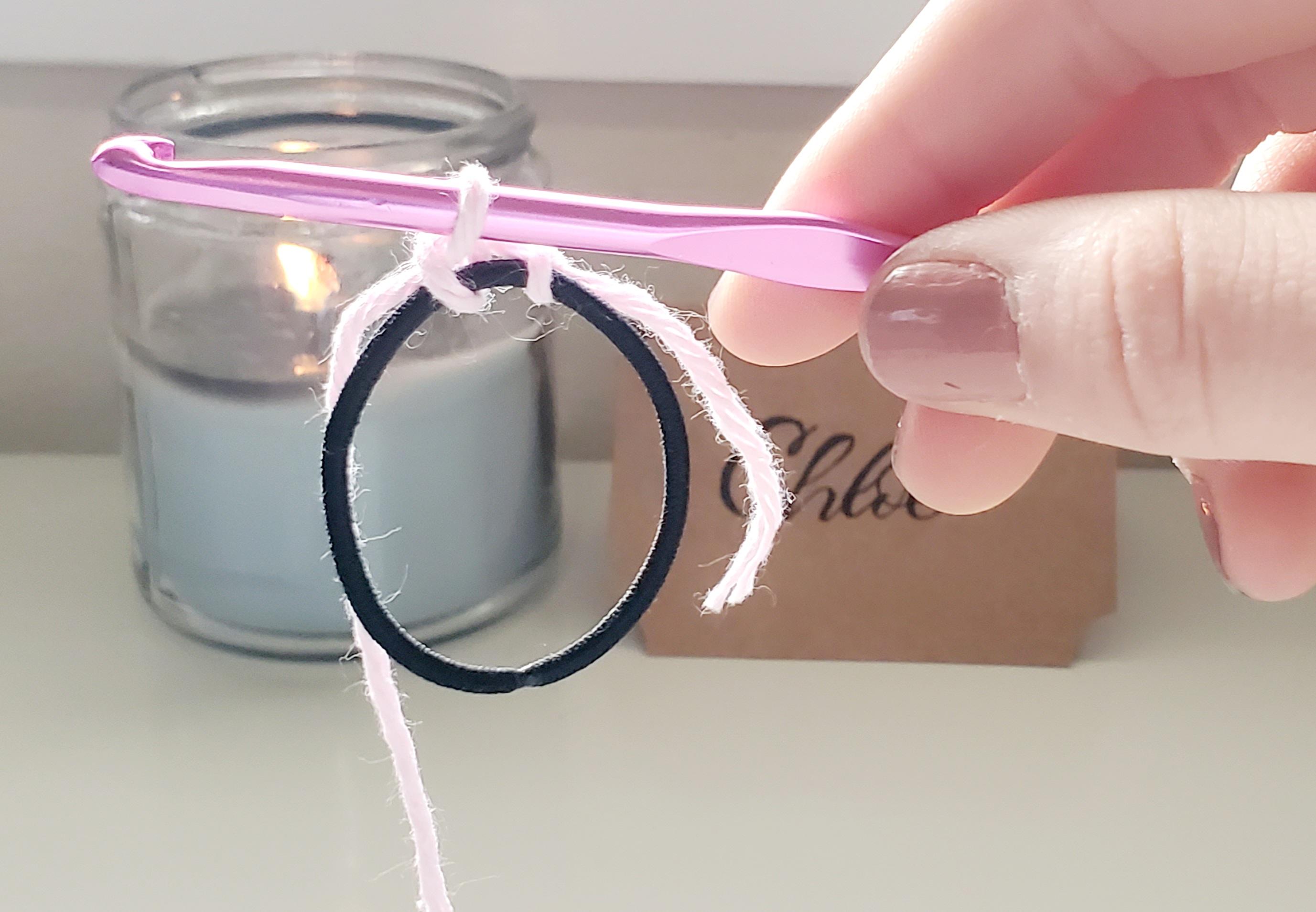Round 1: Tie a knot onto the hair tie, pull up a look with your hook, then chain one. Place single crochets all the way around the hair tie, this number will vary depending on your size hair tie. Once you've made it all the way around slip stitch into the first single crochet that you made.