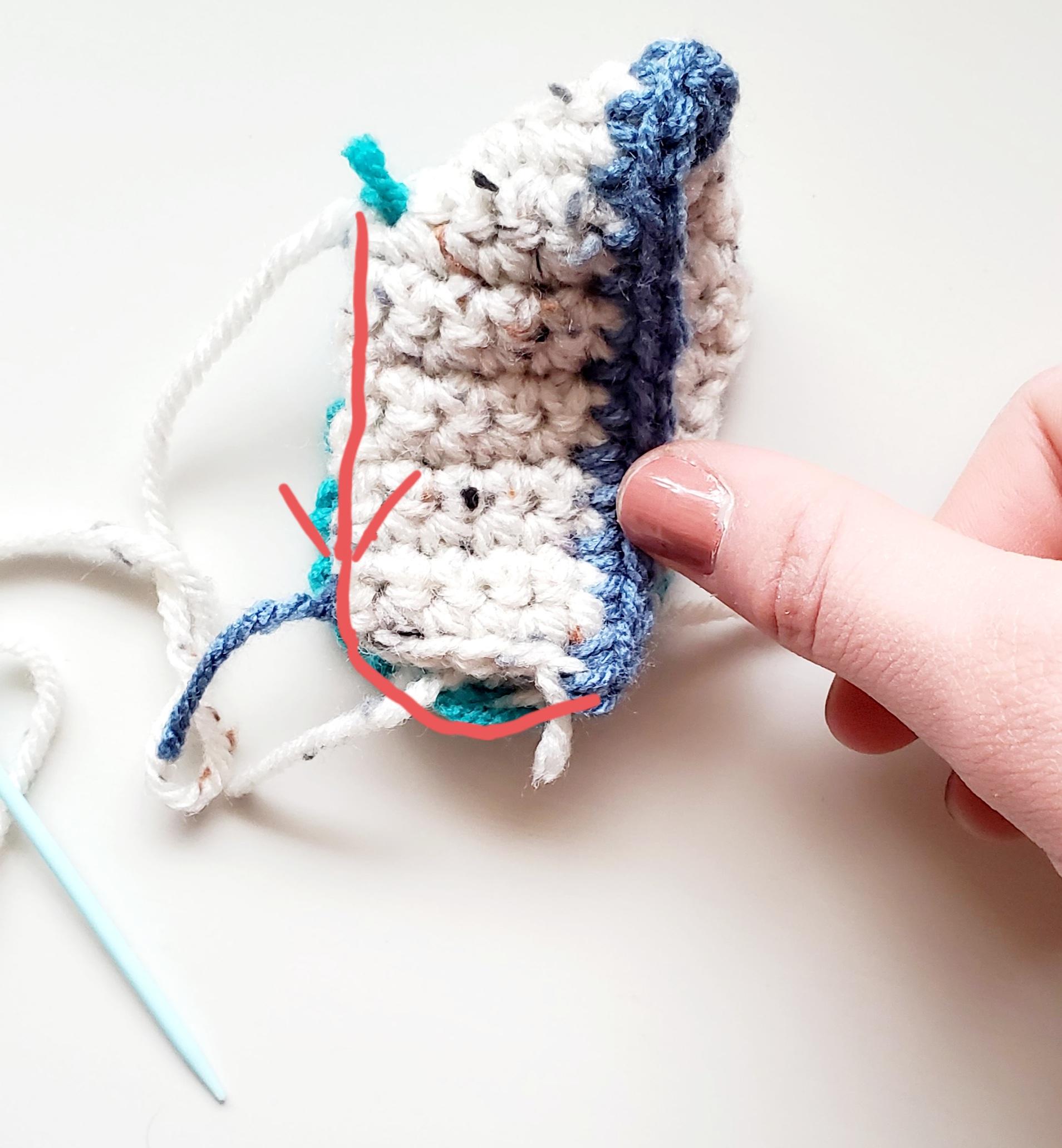 Row 27: Chain one, place one single crochet into the next four stitches. Into the last stitch, insert your hook and pull up a loop, then cut the yarn, pull your contrast color through to finish the stitch.