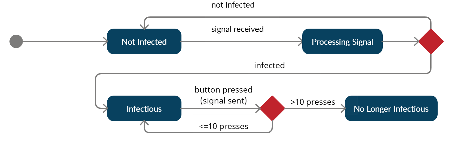 The state transition diagram above shows the different states that the micro:bits used by the class can go through during the simulation.