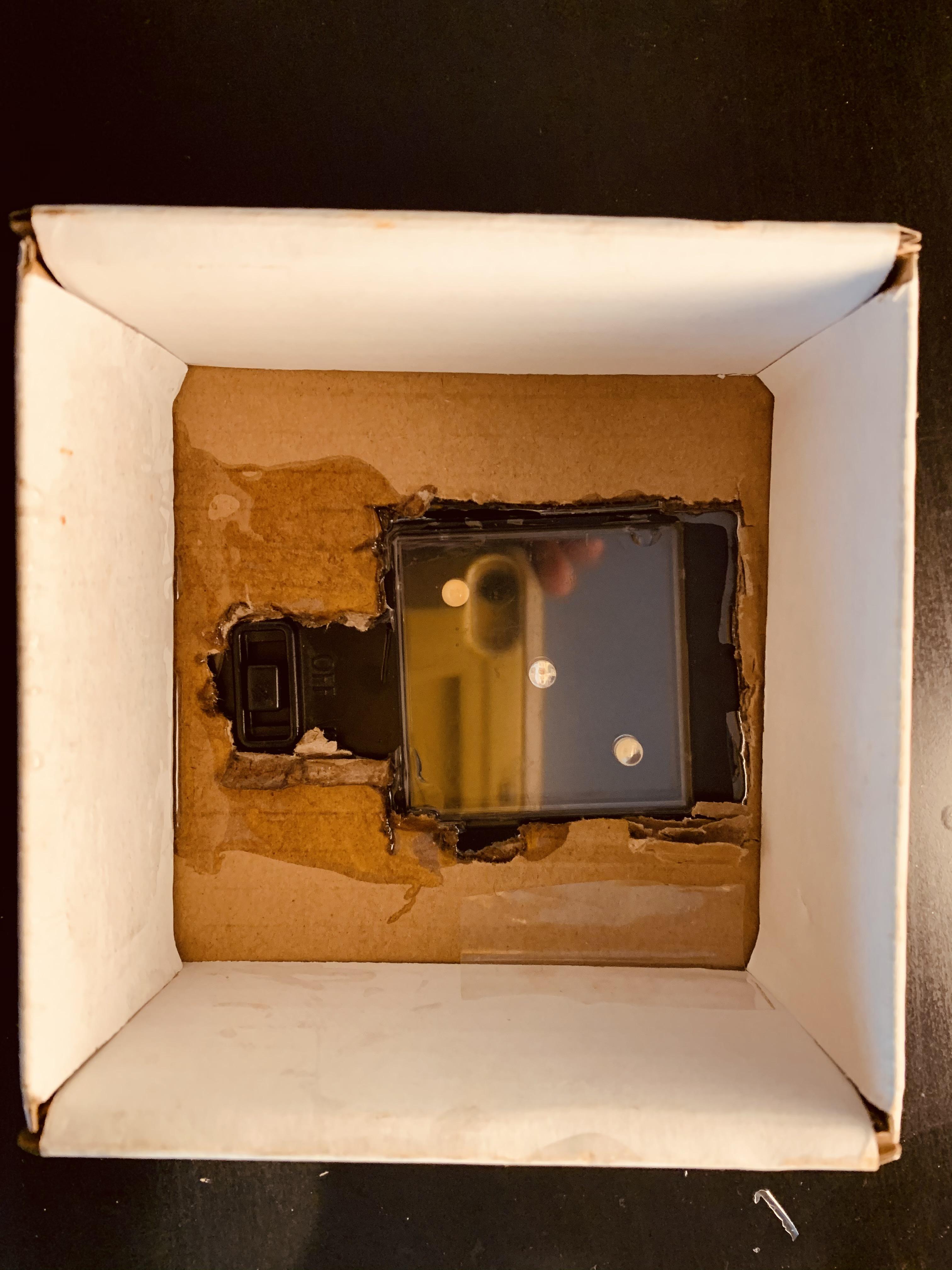 Pick a spot on the cardboard cap to start cutting out a 5/8 cm rectangle (this is the easier option), or you cut a 5/5 cm square and use a pen or marker to mark where the hole for the switch will go. if done correctly the light will fit perfectly just like the image on the left.
