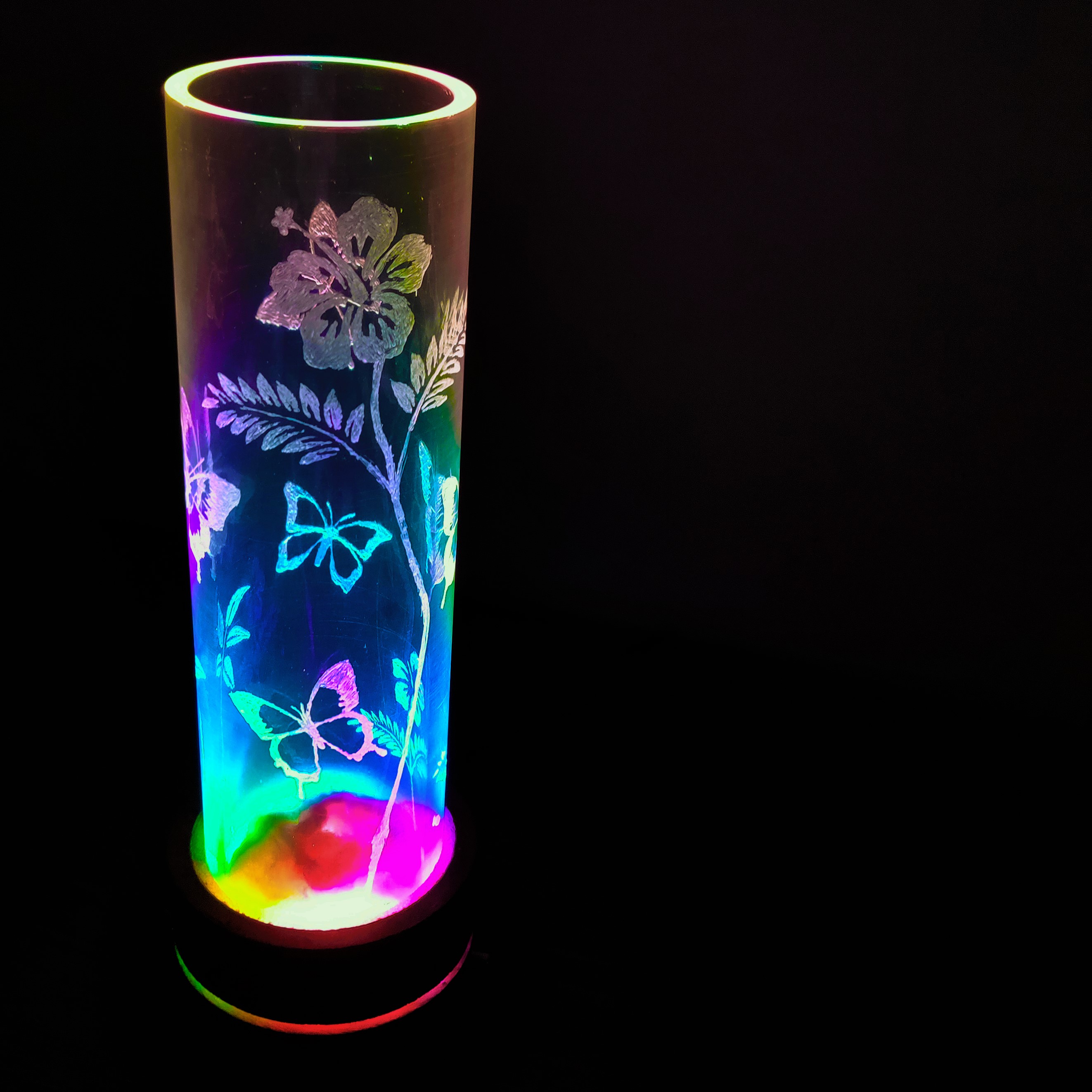 In this Instructable I’ll show you how I build an Acrylic LED Lamp with WS2812B addressable RGB LEDs, Acrylic Cylinder with engraved butterflies and flowers on it and Wooden base with circular RGB Ring in between. Using 18 RGB-LEDs each controlled by a single WS2812 RGB-Controller. It uses only 5 or 6 watt and providing 6 different modes that are controlled by a Arduino pro mini 328 5V/16MHz board and runs on 5v power supply.