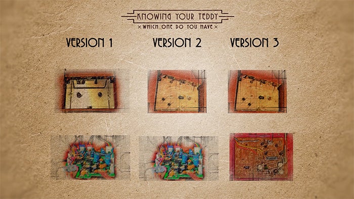 With absolutely zero knowledge of how the Teddy Ruxpin works, I turned to my external brain drive (the internet) for answers on where to start. I found out that there were three versions of the original teddy, so before I could troubleshoot it, I needed to find out which version I had. The chart below shows how you can tell which version of the teddy you have. Version 1 had a metal tape player and a green circuit board, version 2 had a plastic tape player and a green circuit board, and version 3 had a plastic tape player and a beige circuit board.