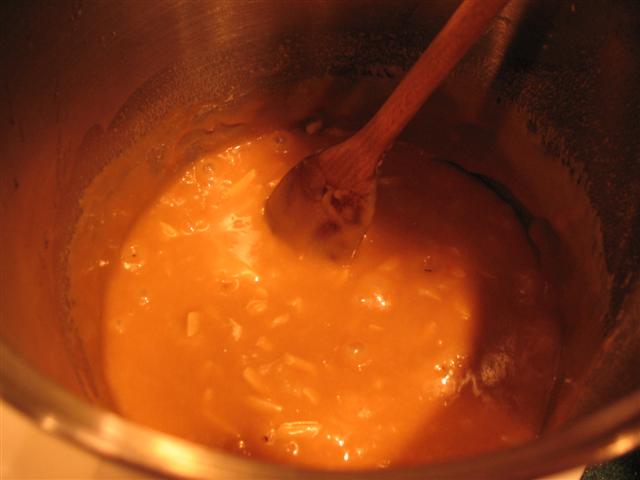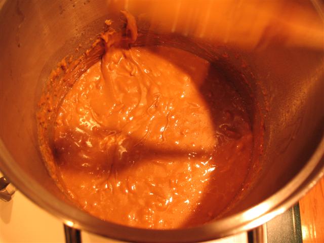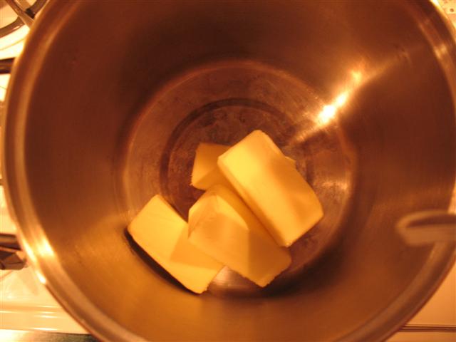 Put all four sticks (1 pound) of butter into the pot. Turn the stove on medium heat and melt the butter, stirring often.
