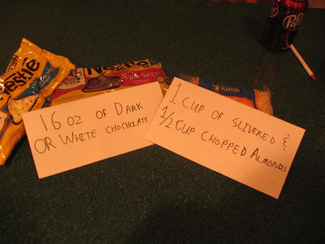 -1 1/2 cups of blanched, slivered almonds, unless you're allergic. (1 cup will go into the Rocha, and 1/2 cup will be chopped and sprinkled on top.)