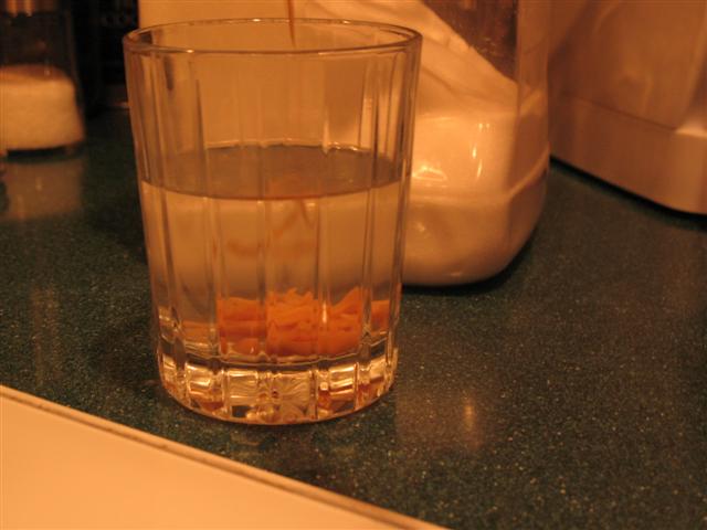We are almost done with the Rocha! Once the Rocha is caramel in color, reduce the heat to low, and continue cooking for several minutes, stirring often (still). After several minutes, you should begin testing the Rocha to see if it is done. To do this, you must take the spoon, and drop a little bit of the Rocha into the cup of cold water I mentioned in the Gather the Ingredients step. You can tell the Rocha is done if it is crunchy when you bite it (after it has cooled in the water).