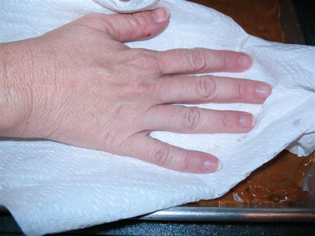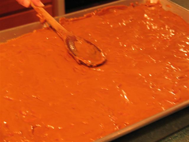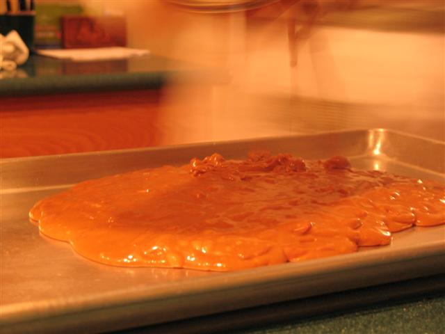 Once the Rocha is done, pour it into the 12"x18" jelly roll pan. Once the Rocha is in the pan, spread it using the wooden spoon. Let the Rocha cool for a few minutes, if some butter separates to the top, blot it using the paper towel.