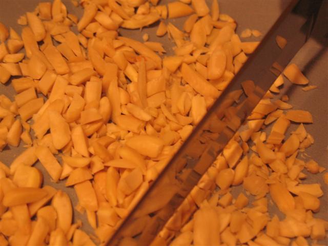 Measure out approximately 1/2 cup of blanched, slivered almonds. Chop the almonds using a non-serrated knife. Once the almonds are chopped thoroughly (see picture two), sprinkle them onto the Rocha.