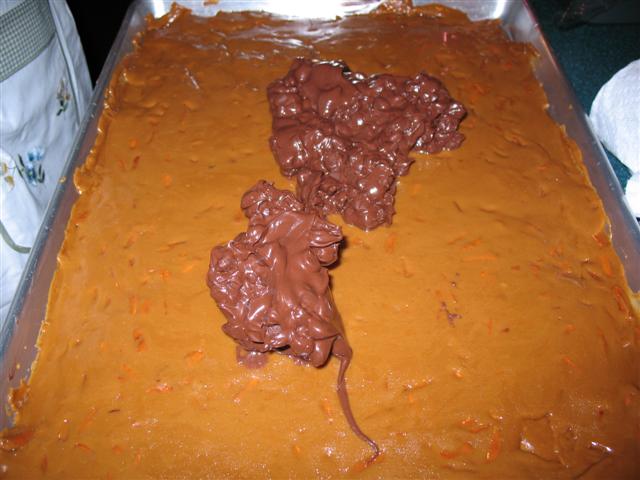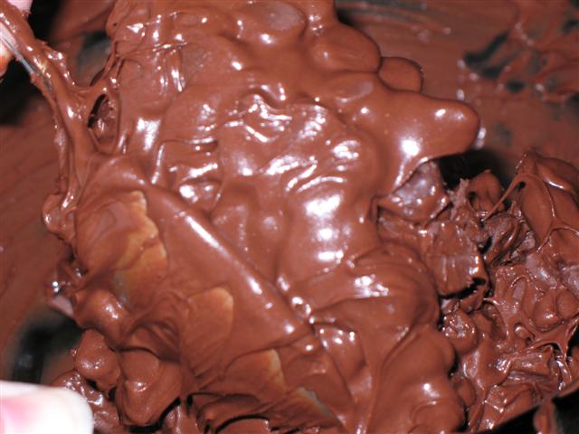 Weigh 16 ounces of either white or dark chocolate. For a half and half batch, weigh out 8 ounces of white and 8 ounces of dark chocolate. Microwave the chocolate for 2 minutes at 50% power. After you melt the chocolate, stir it with a spoon until it is soft and creamy. Then pour onto the Rocha and spread until smooth, or you could draw a smiley face or spell "Happy Birthday" if you are making the Rocha for a special occasion.