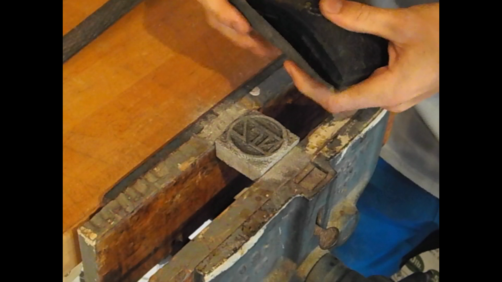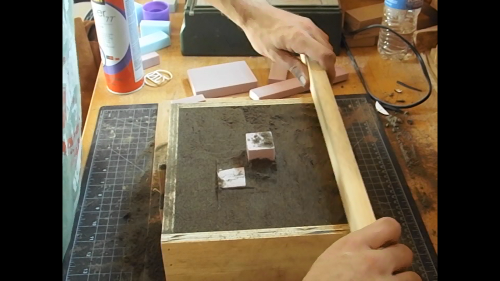 3.) Center the etched foam piece inside the bottom of one half of the box with the logo facing up. Sift some green sand into the box and ensure that it gets packed tightly into all the details of the brand. Take a square piece of wood and use it as a ram rod for ensuring that there are no voids in your casting box. Over fill the box slightly with packed sand and then drag a straight piece of wood across the top to make the sand smooth.
