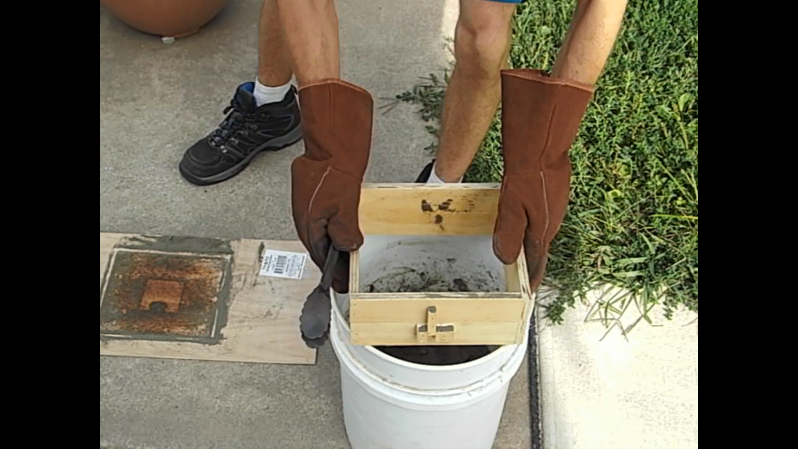 4.) In about 10 to 15 minutes you can dump the sand mold into a bucket for easy clean up and storage. Fish the metal out of the sand with a pair of tongs or pliers and look at how it came out. It is still extremely hot so be careful.