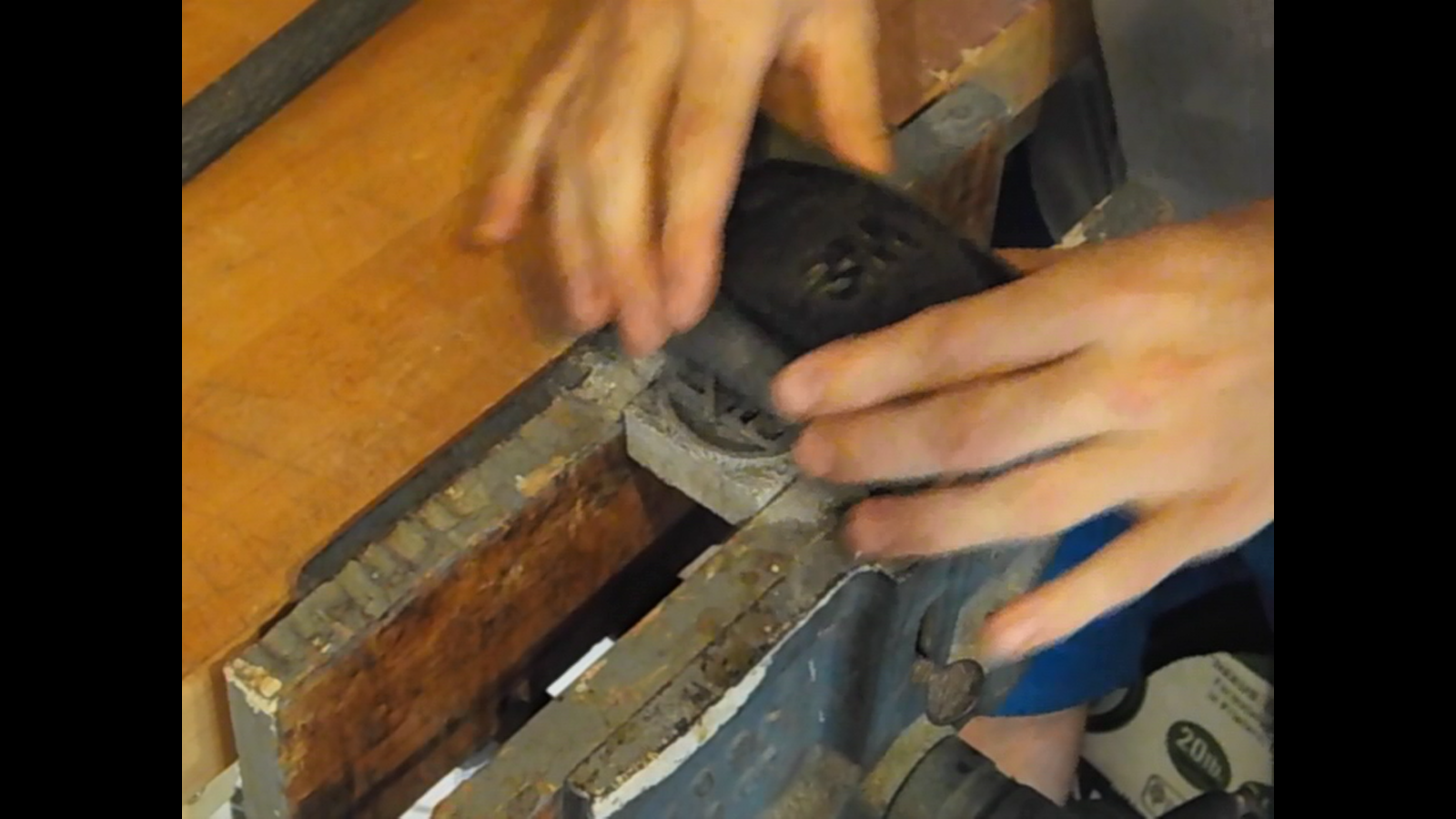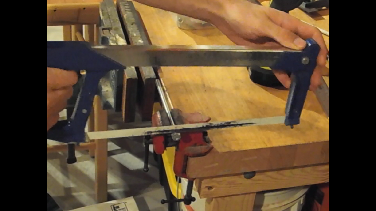 1.) Use a band saw, reciprocating saw, or hack saw to cut the riser off your branding iron.