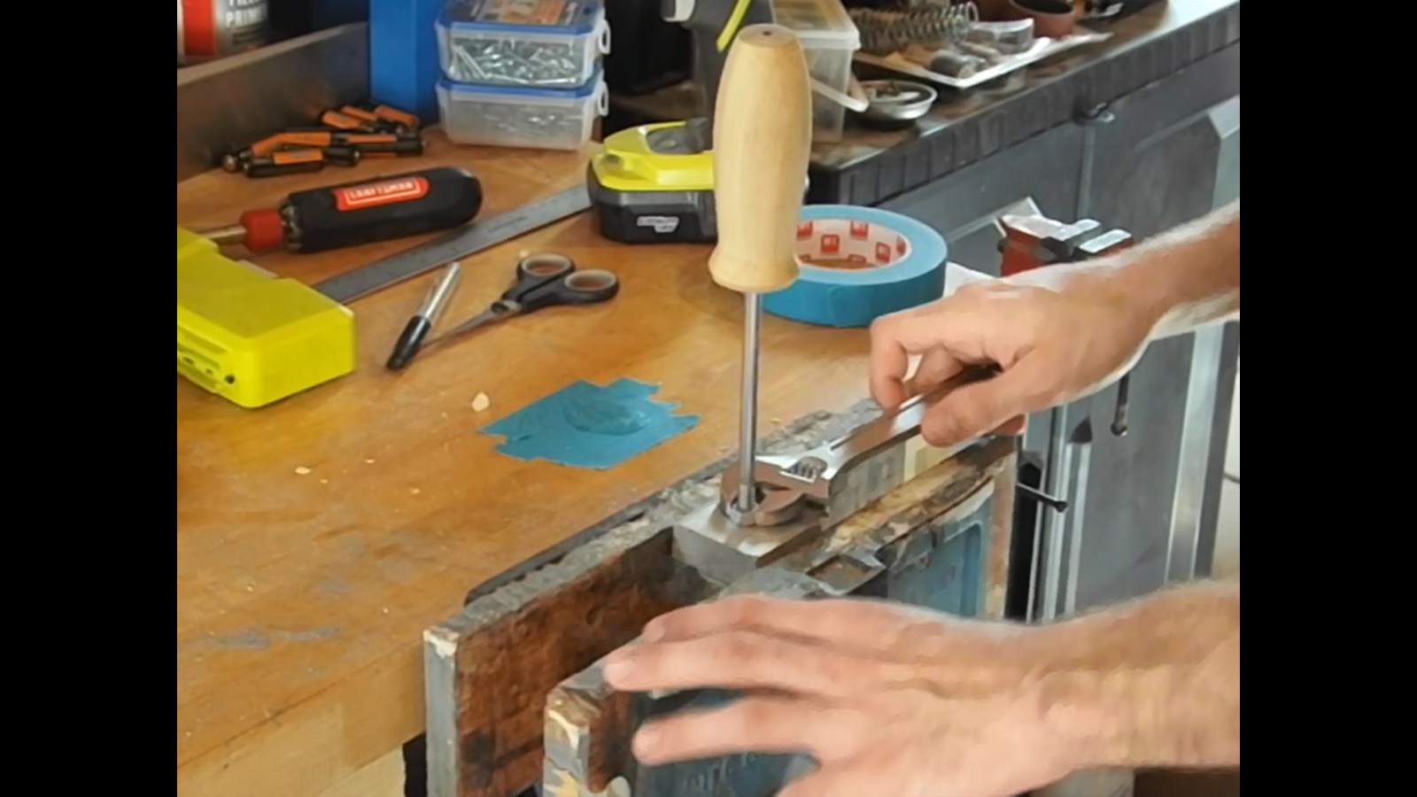 3.) Put the aluminum in a vise with the brand facing up. Take a sanding block and some sand paper and sand across the logo until the whole thing is shiny. This ensure that it is flat on top and will all come into contact with the wood when it is heated up