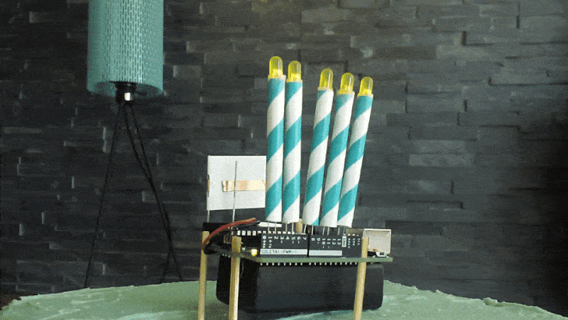 If the Arduino Uno is powered and the candles are in place, they will go out when the switch is closed by blowing on the flag.