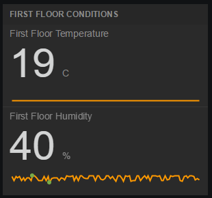 We have just two Panes left to create, and these will be simple. The next Pane we will make is the one that will display the indoor temperature and humidity. the process for creating this Pane will be very similar to the Weather Pane, we will just change the data source. So, add another Pane and position it to the right of the clock. Click the Wrench icon and name the Pane with the location of the Arduino sensor, for example, First Floor Conditions. Add a Widget to the Pane. In the TYPE dropdown, select Text. In the TITLE field, enter <Room Name> Temperature. In the SIZE dropdown, choose Big. Then, in the VALUE field, input datasources["Dweet.io"]["temperature"]. Choose YES for both the INCLUDE SPARKLINE field and the ANIMATE VALUE CHANGES field. Finally, set the UNITS field to match the units specified in the Arduino sketch on line 94.