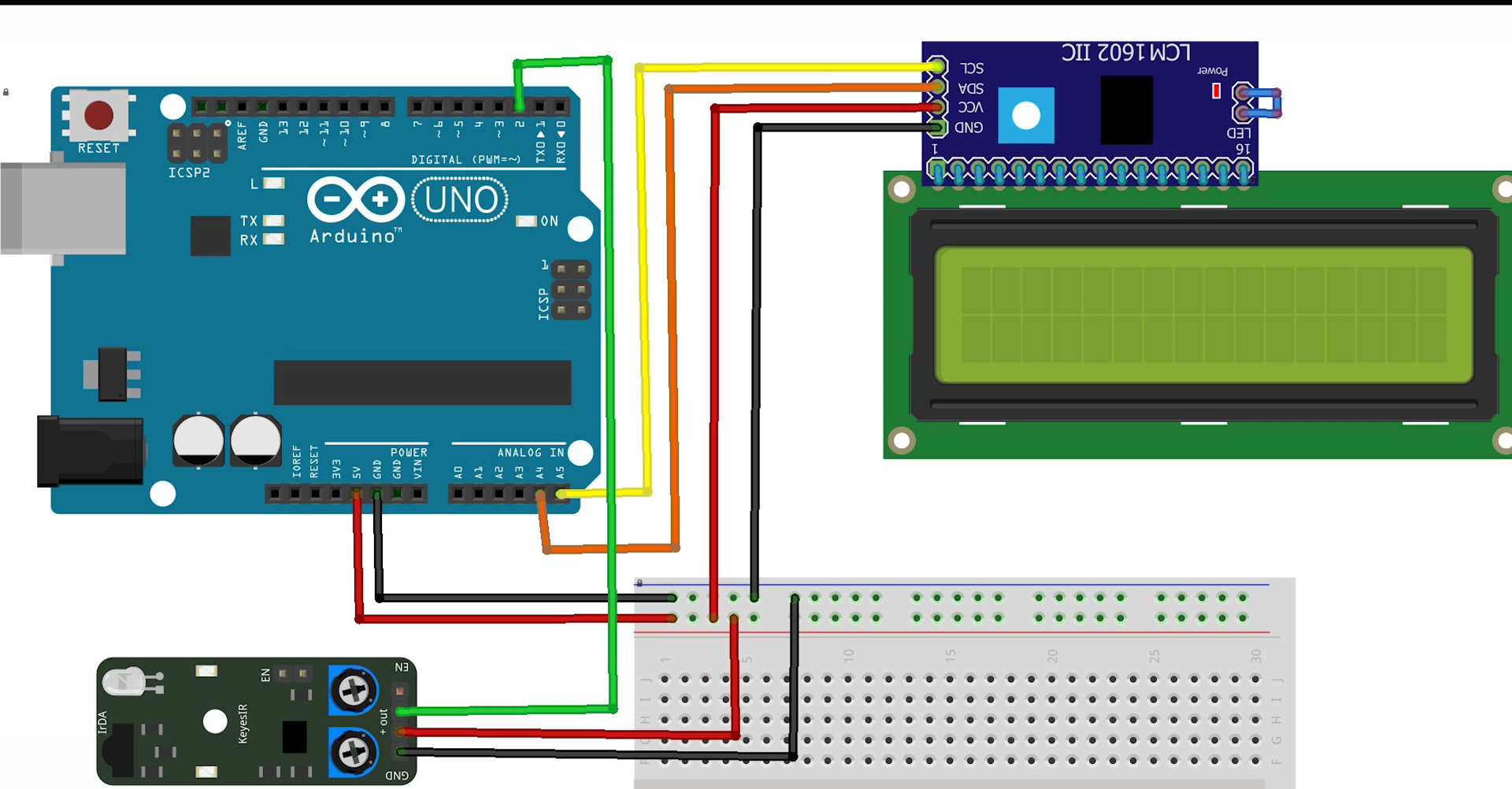 From the above wiring diagram you can see the IR sensor and LCD display VCC and GND are powered from 5V and GND pins of Arduino respectively. The OUT pin from the IR sensor module is connected to the digital pin 2 on Arduino. SDA and SCL pins from the LCD display are connected to A4 and A5 of Arduino respectively. That’s it for connection now lets upload the below code and see how this works below.