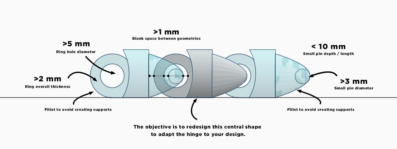 - All elements parallel to the work floor should have an angle of 45 to 60 degrees. This will allow us to print them without using supports that could affect the operation of the hinge.