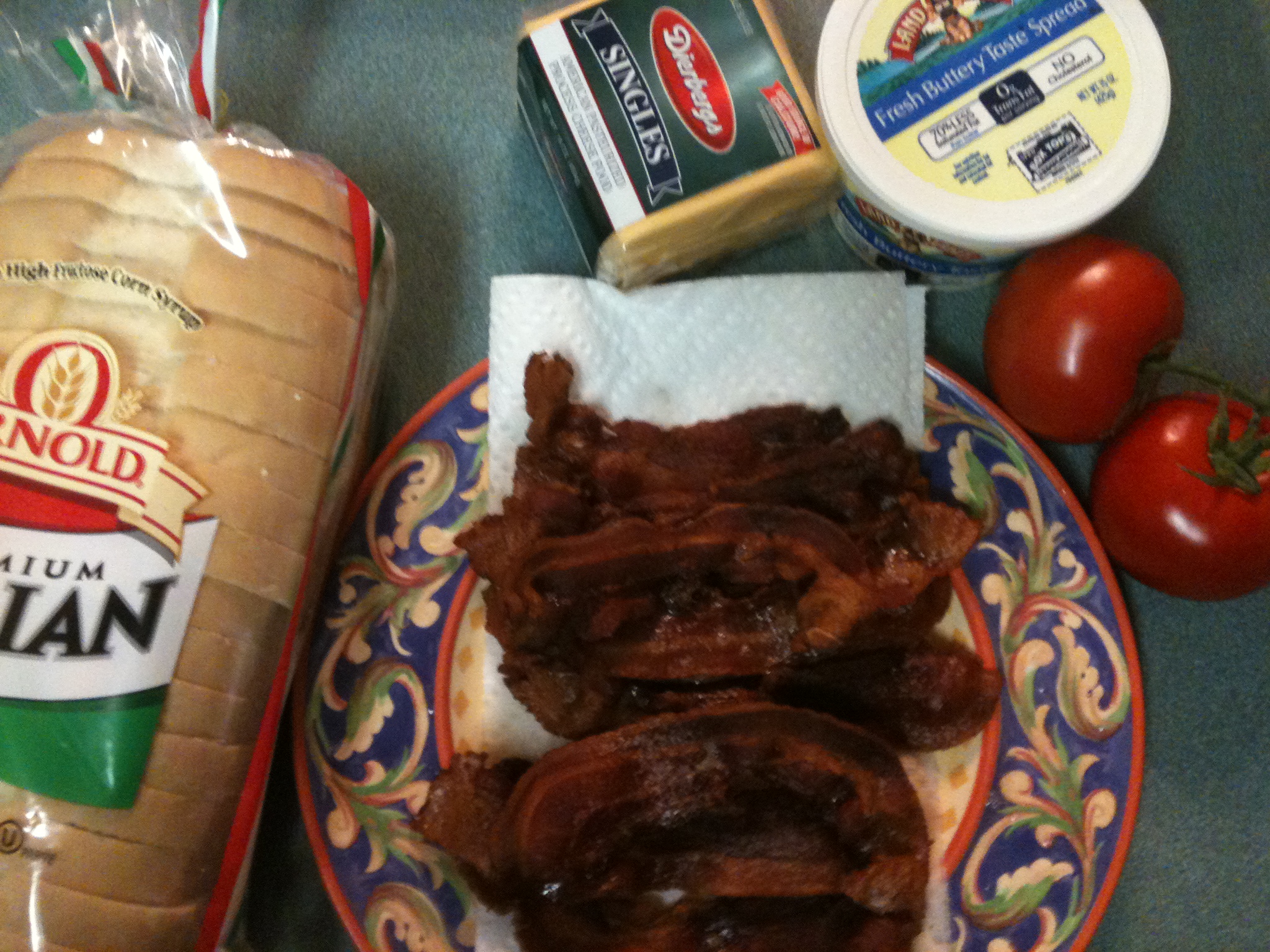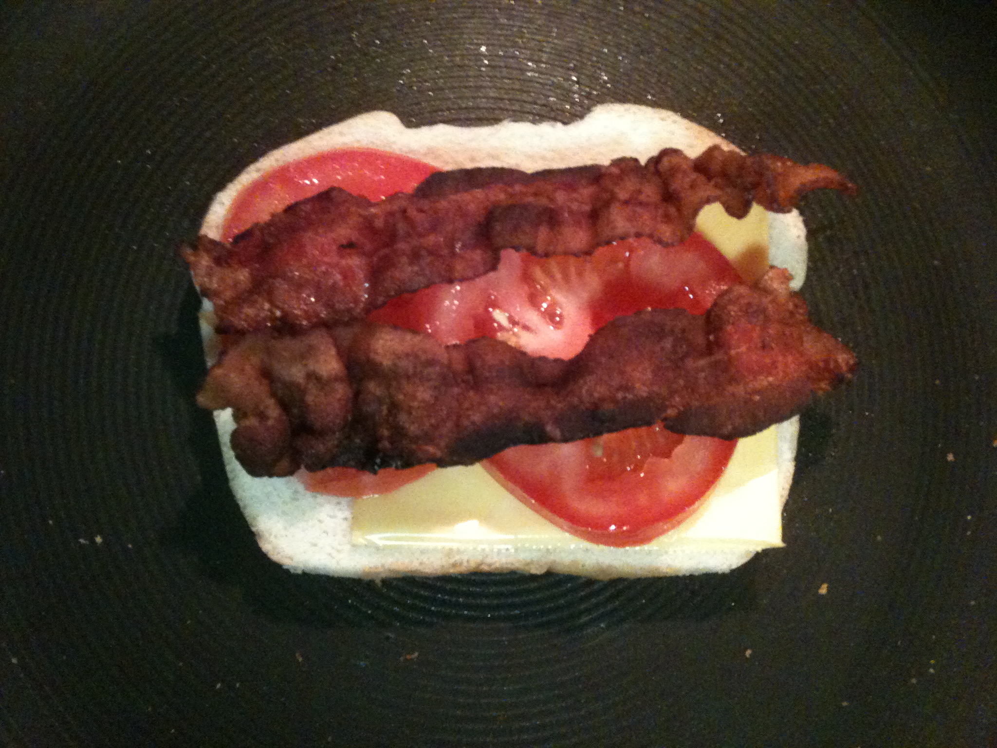 Place 2 slices of bacon on the tomatoes and another slice of cheese. Butter another slice of bread and place it on top butter side up.