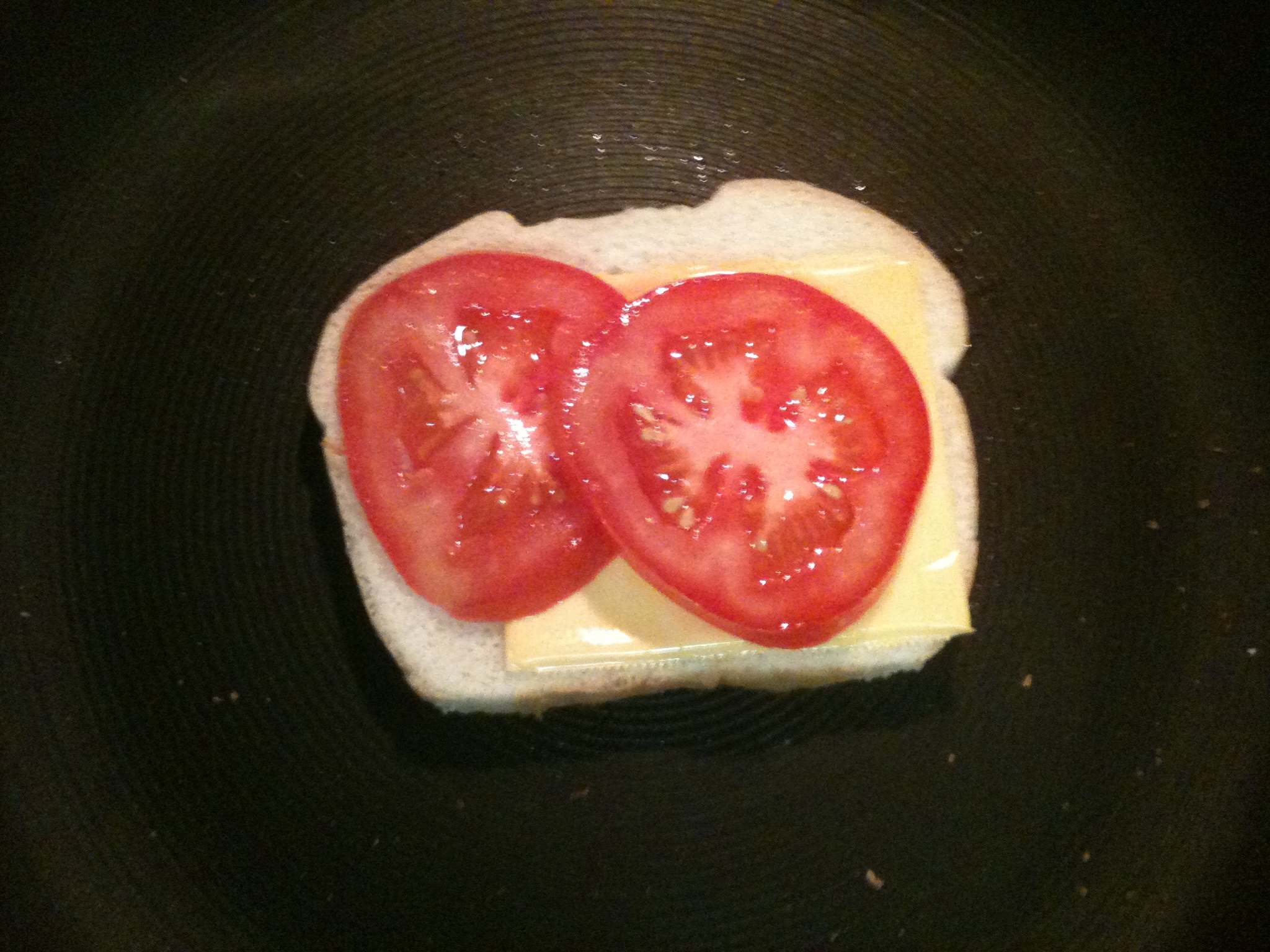 Lightly butter a piece of bread and place it on your skillet over medium low heat. Add 1 slice of cheese and 2 tomato slices.