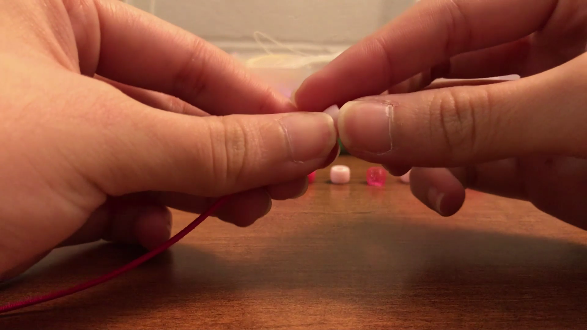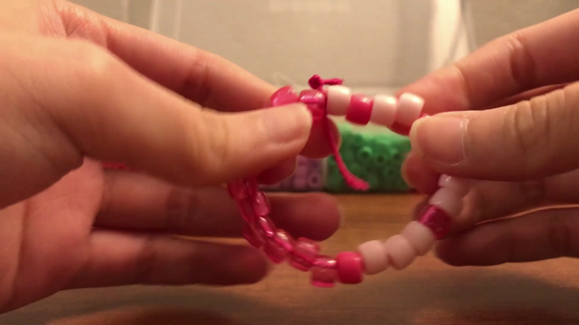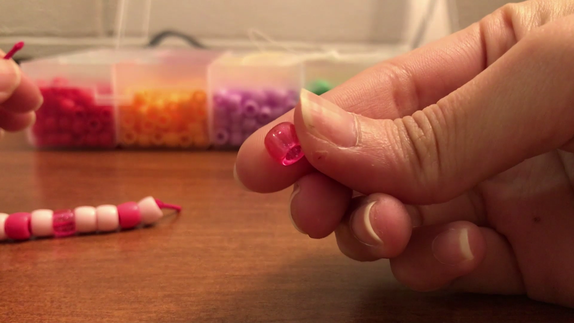 5) Now, begin putting the clear pink beads onto the rest of the cord so you can make an actual bracelet