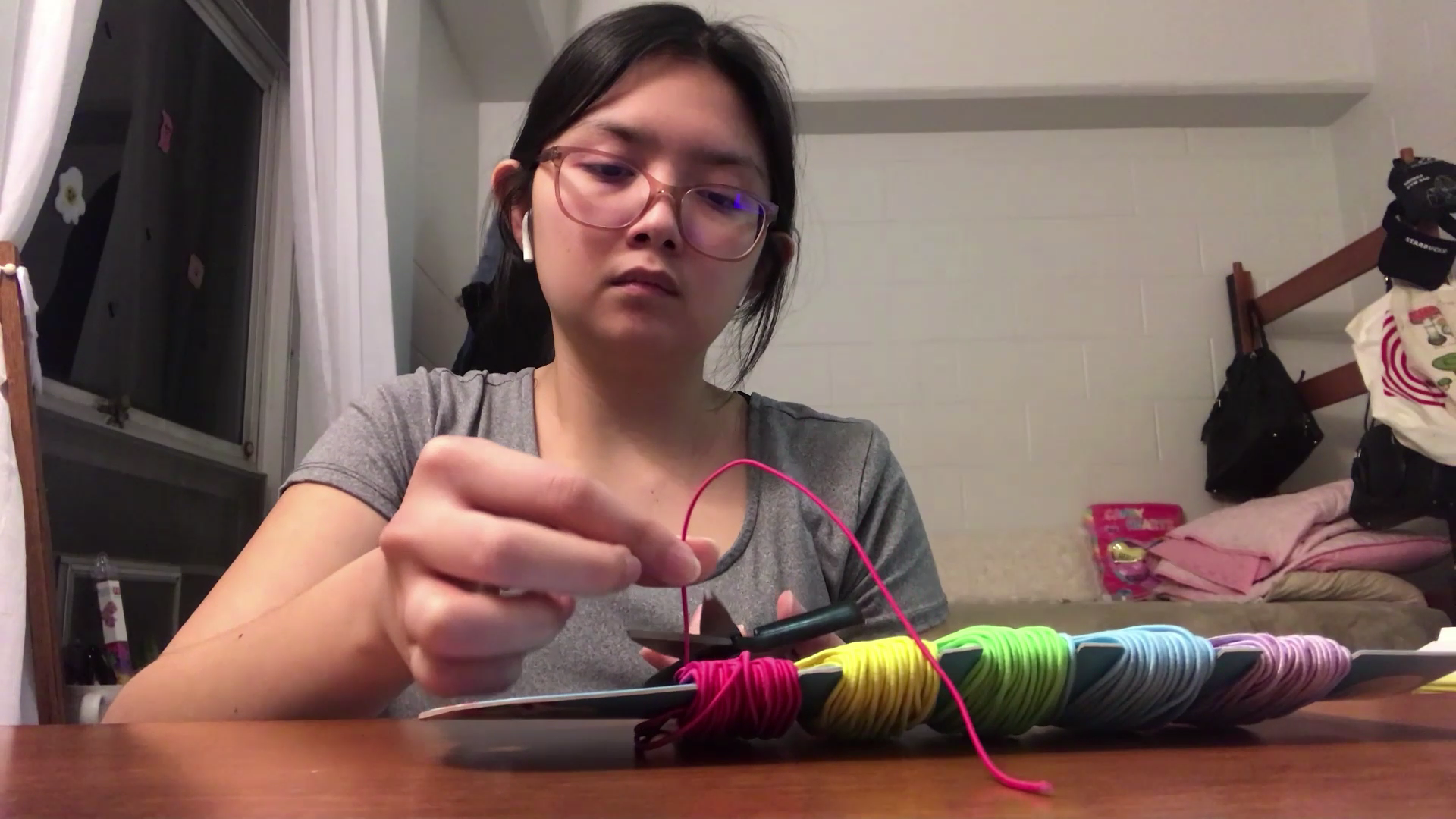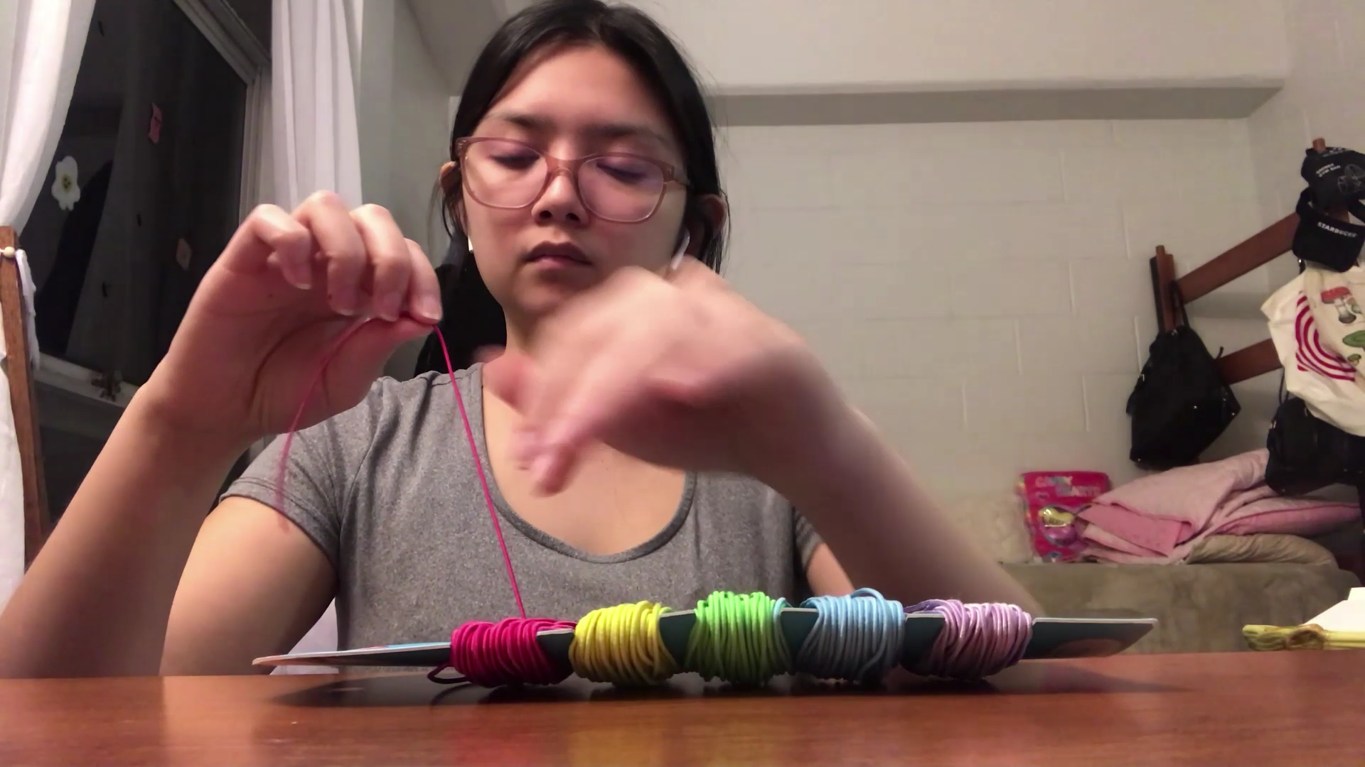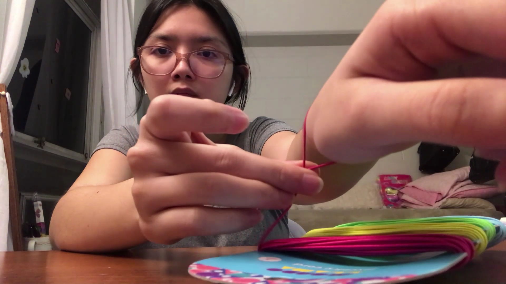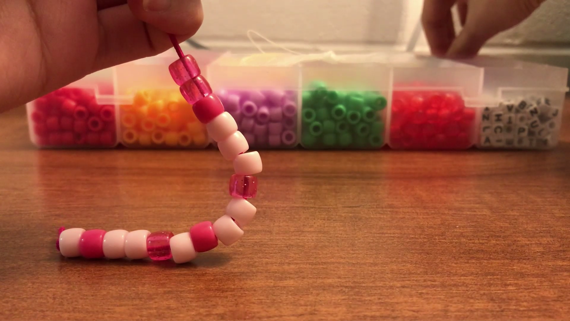 5) Now, begin putting the clear pink beads onto the rest of the cord so you can make an actual bracelet