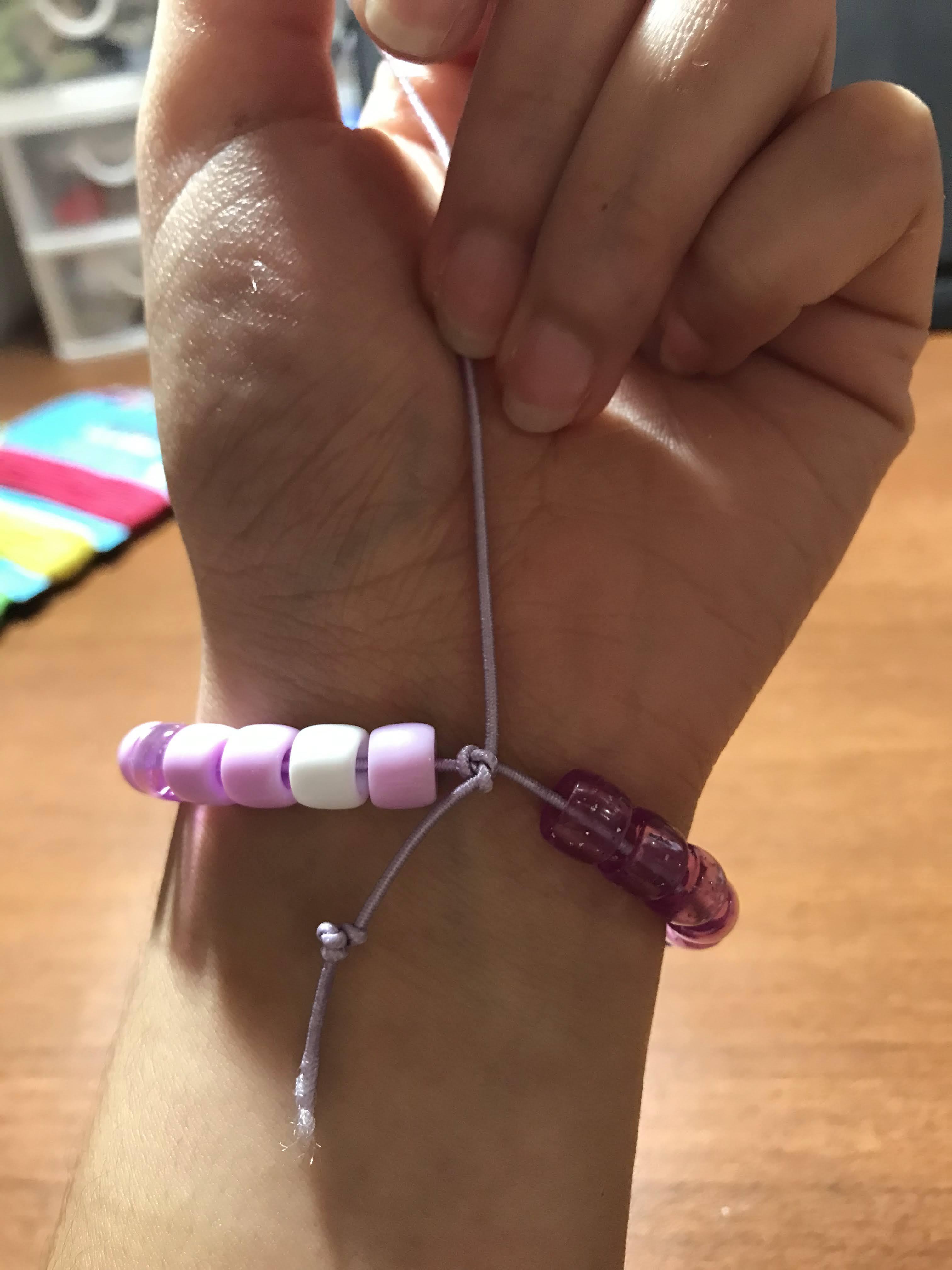- If there aren't enough beads to cover the circumference of your wrist, add more transparent purple beads