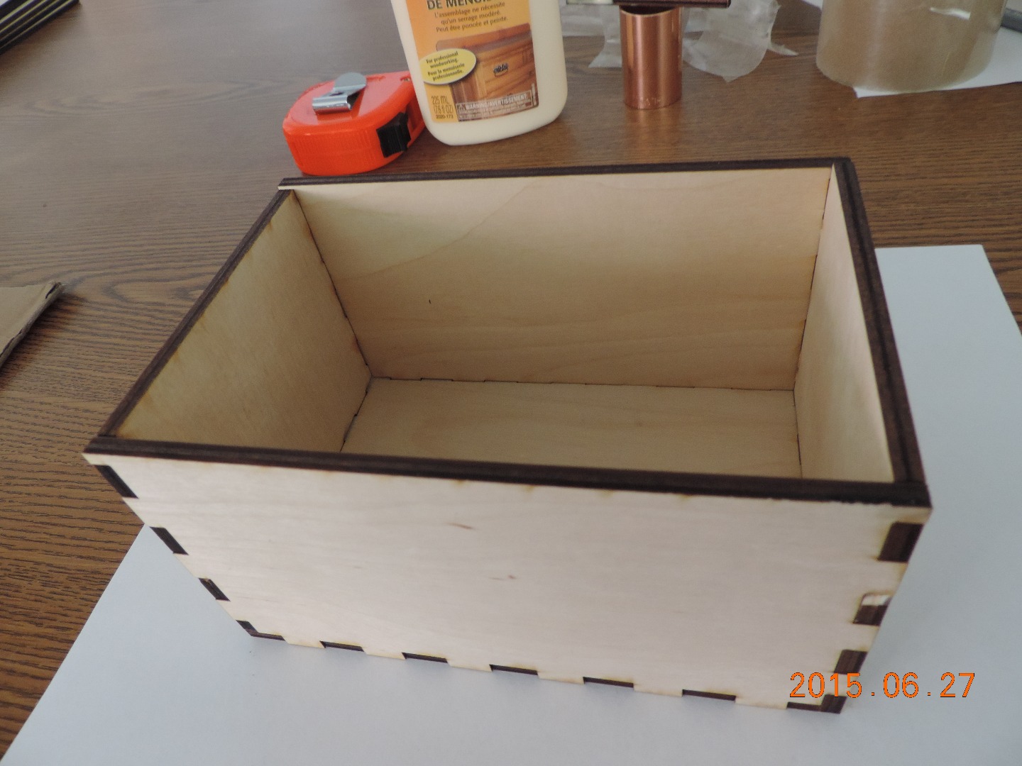 Remove the finished pieces and move to a surface large enough to lay out the base with its sides. Now you are ready to assemble. Whether you are using the cardboard or the wood, put the elements together without glue to ensure that you put the cut lines where they were supposed to be. If all is great, proceed to do the same for the lid. If you are working with the wood cut outs and all is well then proceed to the gluing stage or if you used cardboard and all is fine, proceed through the steps for the wood pieces and proceed with the gluing. Keep the cardboard pieces if you think you might like to build another case. The cardboard model can assist you in designing your modifications. You might want to consider the ultimate use of your basic case in your choice of glue.