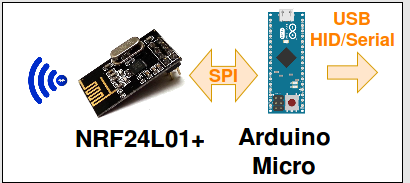 The Bluetooth receptor is wired to an Arduino Micro. Within this particularly impressive board there is an atmega32u4 (same as Arduino Leonardo) embedded which gives it the capacity to emulate HID devices and COM ports at the same time and on the same USB line. Through this, we are able to emulate a keyboard, a mouse, a joystick at the same time and still send data over the serial terminal.