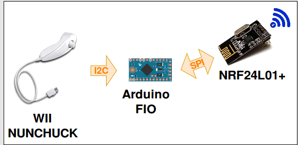 Sources here. To easily implement the detection of the joystick and the buttons, I recommend using this library XXX. It is very fast and easy to understand, so the peripheral Nunchuck Joystick code is really simple once you have understood how the NRF24L01+ works.