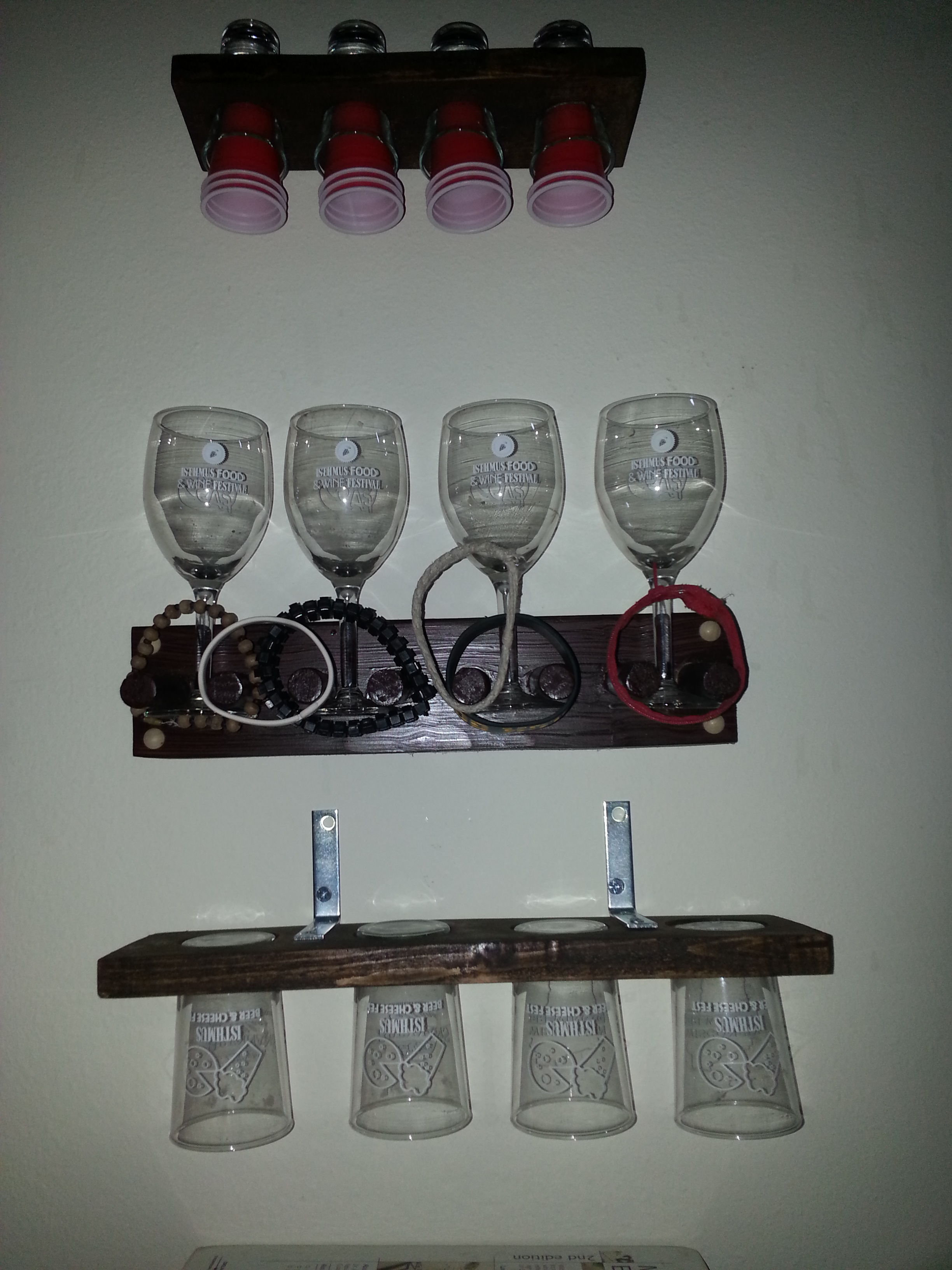 I had a set of glasses that I got at a beer tasting event that I decided to hang on the wall. Theses glasses are pretty cool there smaller and get for small mix drinks. There a cool cocktail drink glass but can also make this will full size glasses. This was pretty easy to make I had scrap wood laying around that I used to make this. I stained mine that's optional but it makes it look a lot nicer. I used L brackets to attach it to the wall. The wood was about 1 inch thick about 15 inches wide by about 4 inches so you don't need a huge piece of wood to make this. You will need a bigger drill bit to make the cuts for the holes. A few tools required can cut the wood even with a hand saw. This goes with my set of shot glass holders and wine glass wall holders.