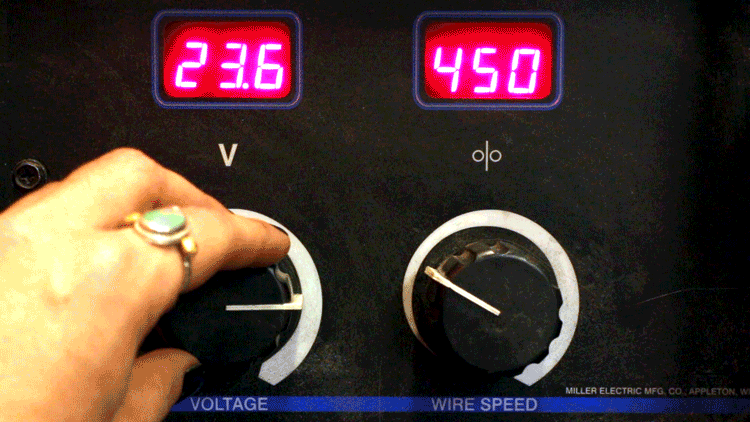 On the outside of the welder, you will find two knobs. One knob controls the speed of the consumable wire electrode that comes out of the torch, and the other knob controls the amount of current that the wire electrode carries. Usually, an increased voltage requires an increased wire speed. This is because you are sending more heat into the wire, and it is being consumed at a faster rate.