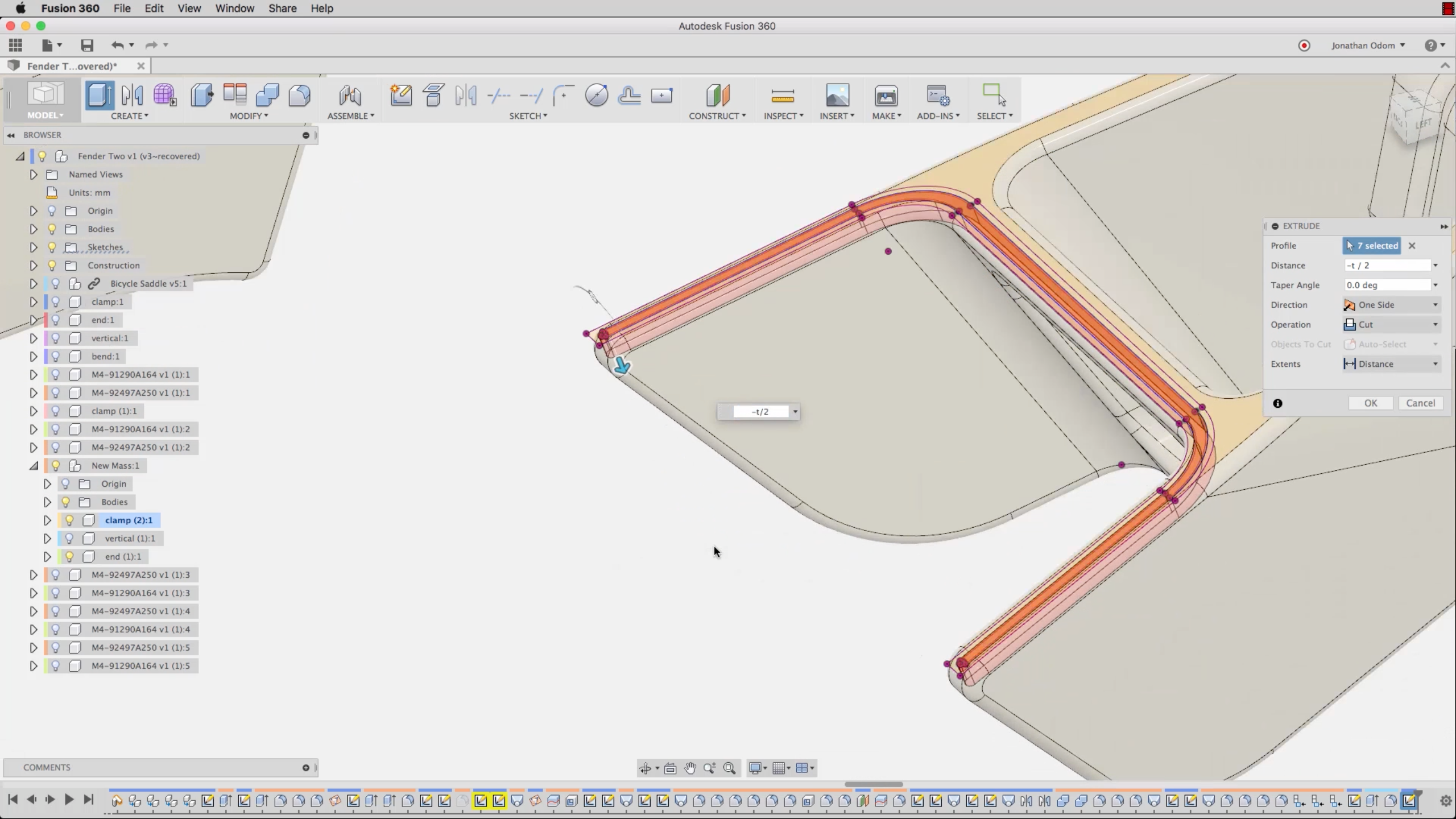 I use the fillet tool on the corners of the fender end and the clamp part to get a rounded profile.