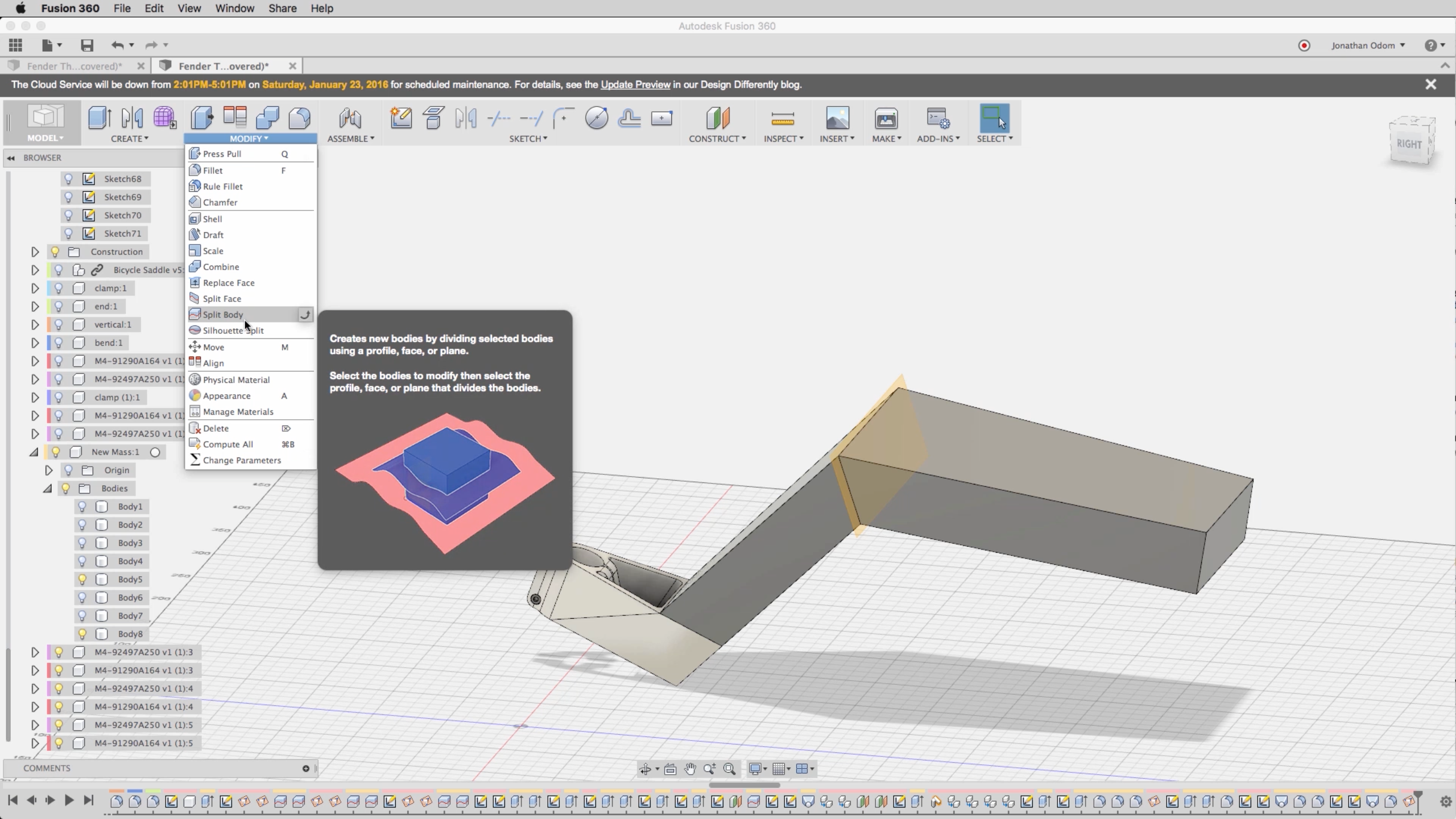 With my two planes in place, I use the Split Body tool in the Modify menu. I repeat the same steps to create the tapered profile on the back end of my new mass.