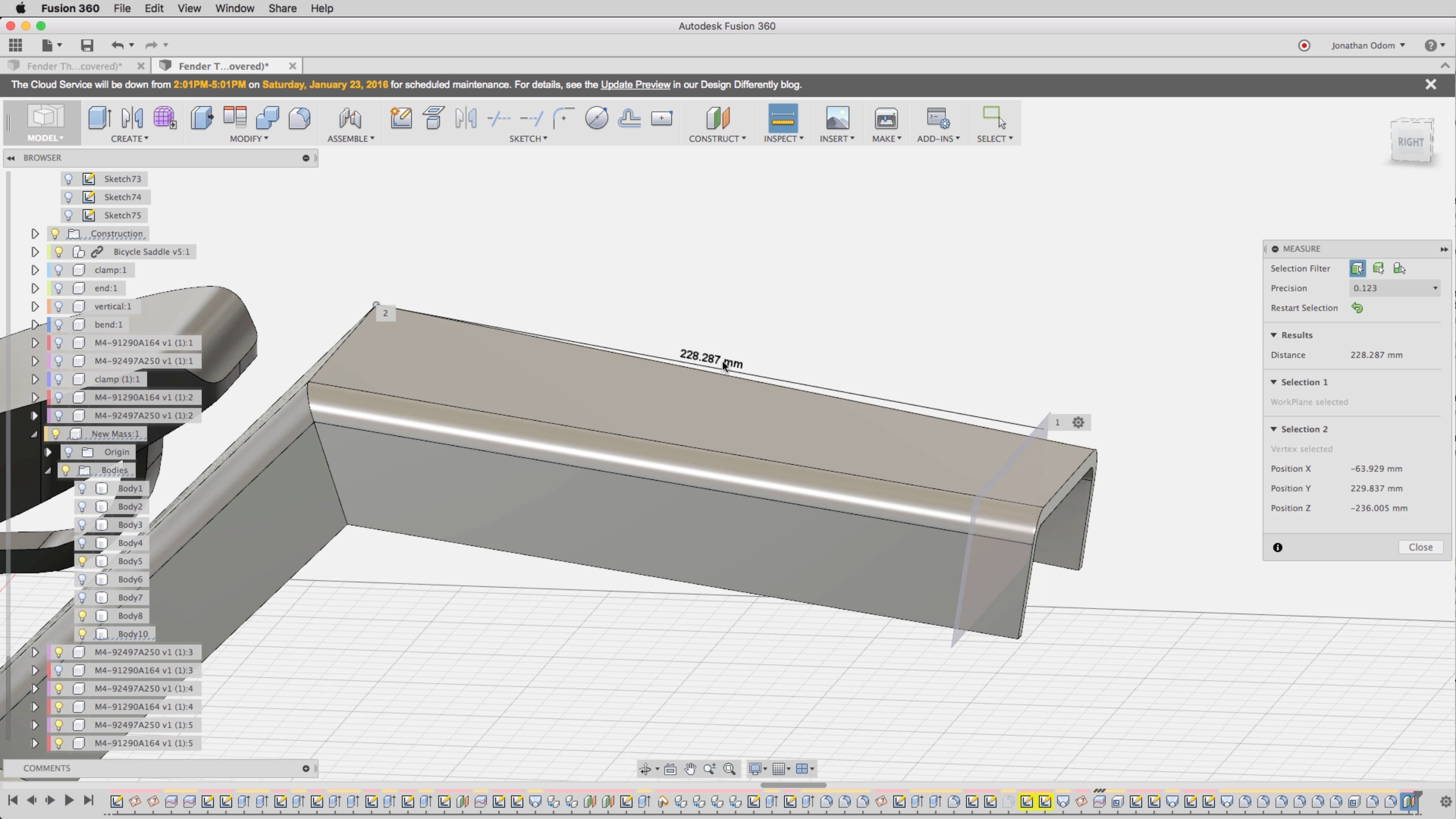 Before I go any further, I need to check and make sure my design will fit in the printer’s build envelope in 3 parts. To do this, I use the Measure tool in the Inspect menu and select the longest edge on my biggest part, the fender end.