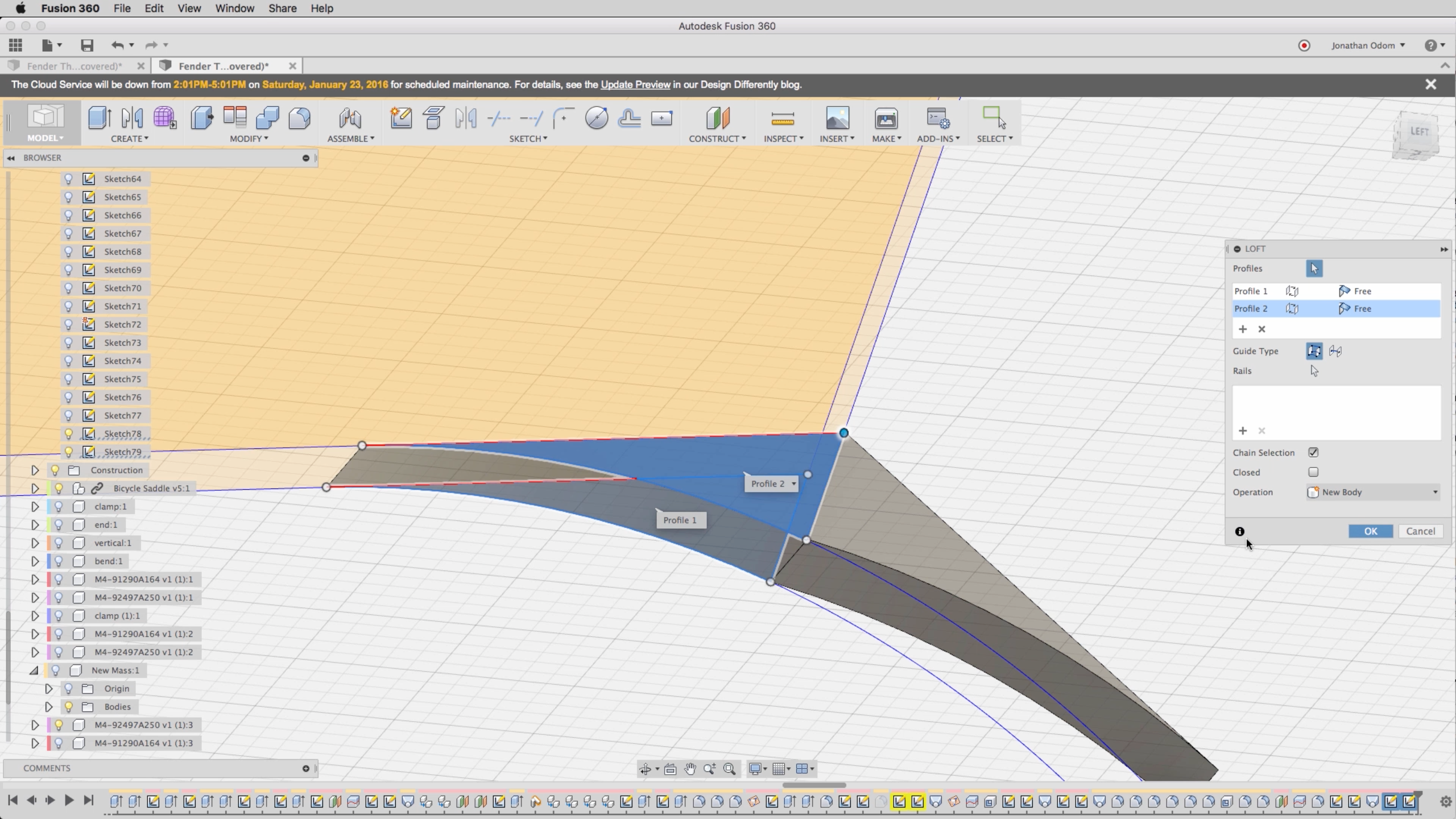 I use the profiles I just created to make new bodies using the loft tool. When I loft this time, I use the New Body operation.